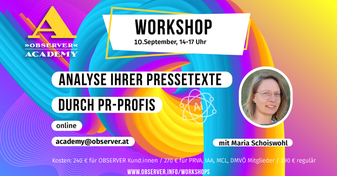 10.09., 14 – 17 Uhr, Online, Kleingruppe: max. 8, Kosten: 240,- für »OBSERVER« Kund:innen/270,- für Verbandsmitglieder/290,- regulär