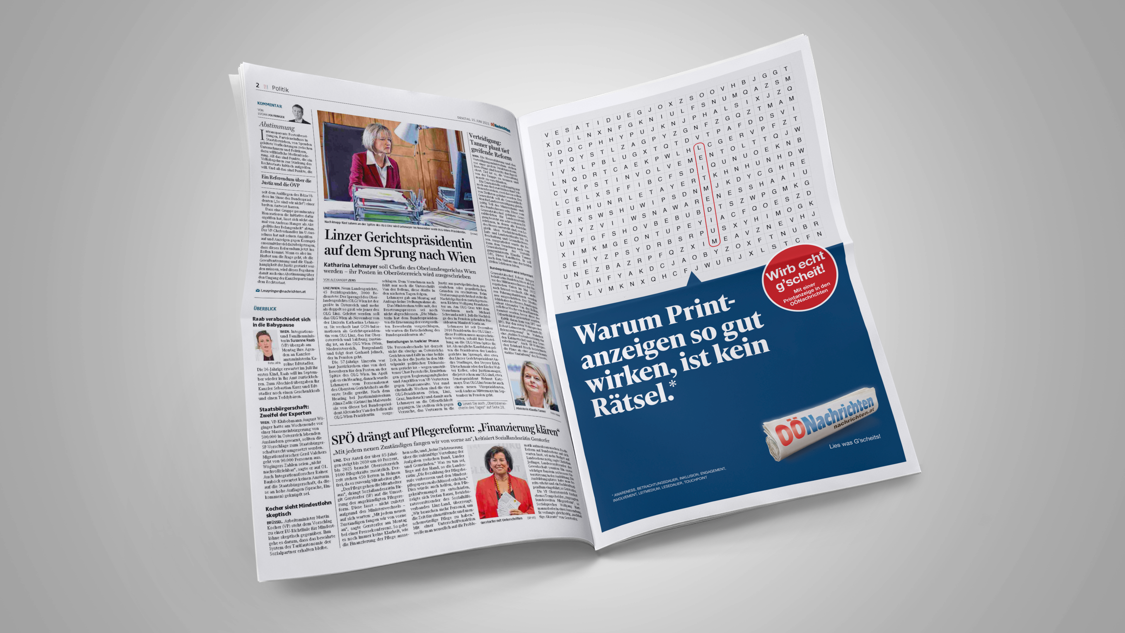 Dabei sollten die OÖN vor allem als starker Kooperations- und Medienpartner für Werbekunden präsentiert werden. Aus dem Marken-Claim „Lies was G‘scheits“ wurde dann der Call-to-Action „Wirb echt g‘scheit“. Die Vorteile von Print (Tiefgang, Sichtbarkeit, Echtzeit, Aufmerksamkeit) wurden passend positioniert und abgestimmt auf die Zielgruppe. Dadurch sind diverse Plakat-Sujets mit verschiedenen fesselnden Headlines entstanden.