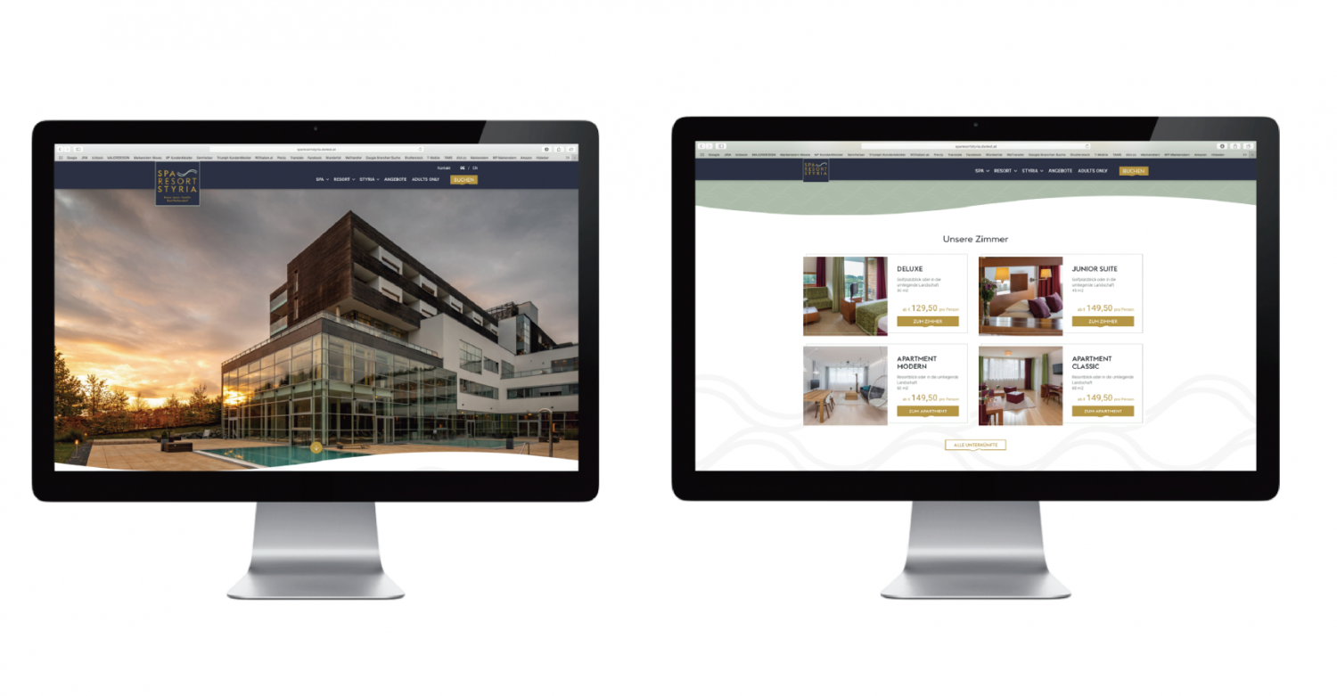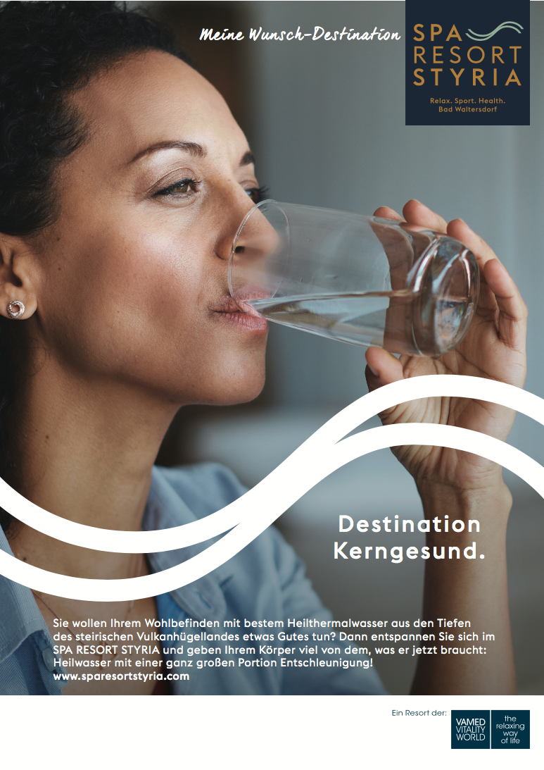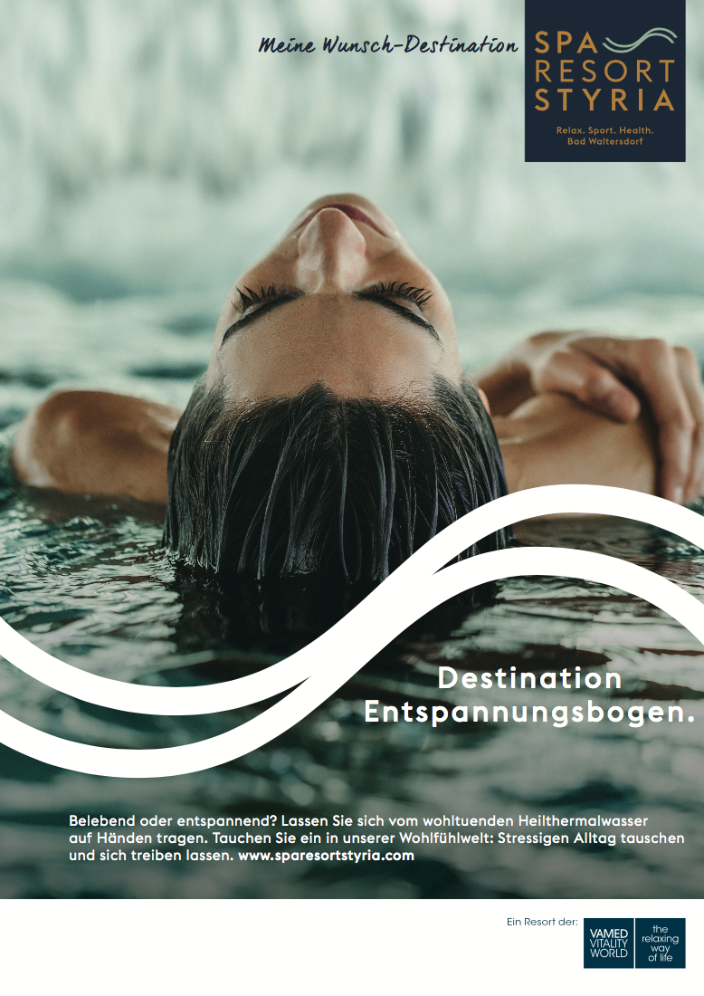 Wesentliches Kampagnenelement stellt das Wasser dar, welches im SPA RESORT STYRIA eines der besonderen Assets darstellt, zumal das Resort direkt an die beiden heißen Heil- und Thermalquellen von Bad Walterdorf angeschlossen ist. Die Welle fungiert als Key Visual, sowohl im Logo, als auch in der Print- und Online-Kampagne.