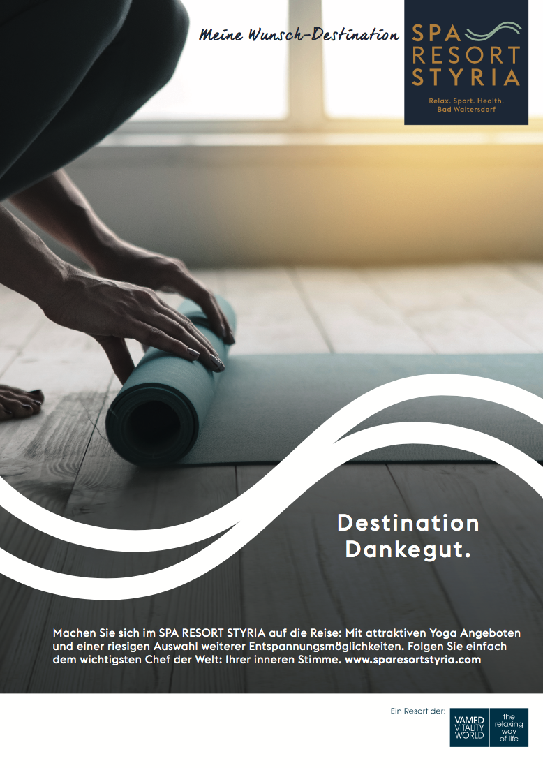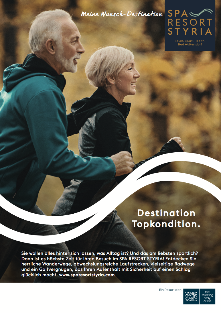 Der Claim verortet das Resort für den kosmopolitischen Menschen mit „Meine Wunsch-Destination“ SPA RESORT STYRIA Relax.Sport.Health. und spielt mit dem Begriff „Destination“ auf inspirierende Weise.