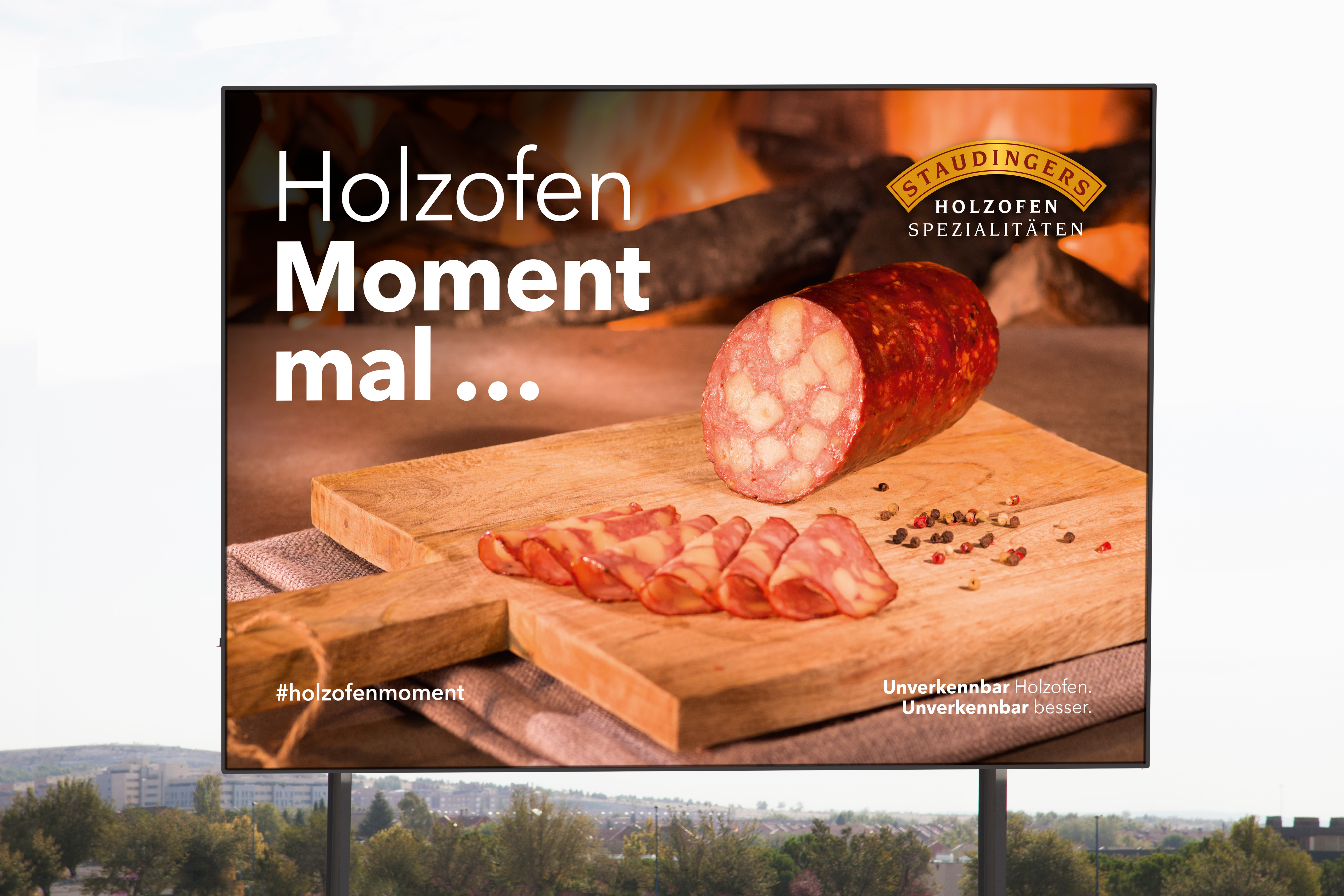 Was Staudingers Holzofenspezialitäten so besonders macht, ist die einzigartige Veredelung über Buchenholz im traditionellen Holzofen. Dieses Verfahren verleiht den Produkten ihren charakteristischen Geschmack – unverwechselbar und authentisch. Ziel sämtlicher Kommunikationsmaßnahmen ist es, die Markenbekanntheit in ganz Österreich weiter auszubauen. Im Mittelpunkt stehen der Holzofen Leberkäse und die Holzofen Käsewurst. Der unvergleichliche Geschmack, der zu einem richtigen Genussmoment führt, steht im Mittelpunkt unserer Umsetzungen: Wir haben der Marke eine emotionale Ebene verliehen. Mit dem Claim „Unverkennbar Holzofen. Unverkennbar besser.“ bringen wir die Essenz der Marke klar auf den Punkt.