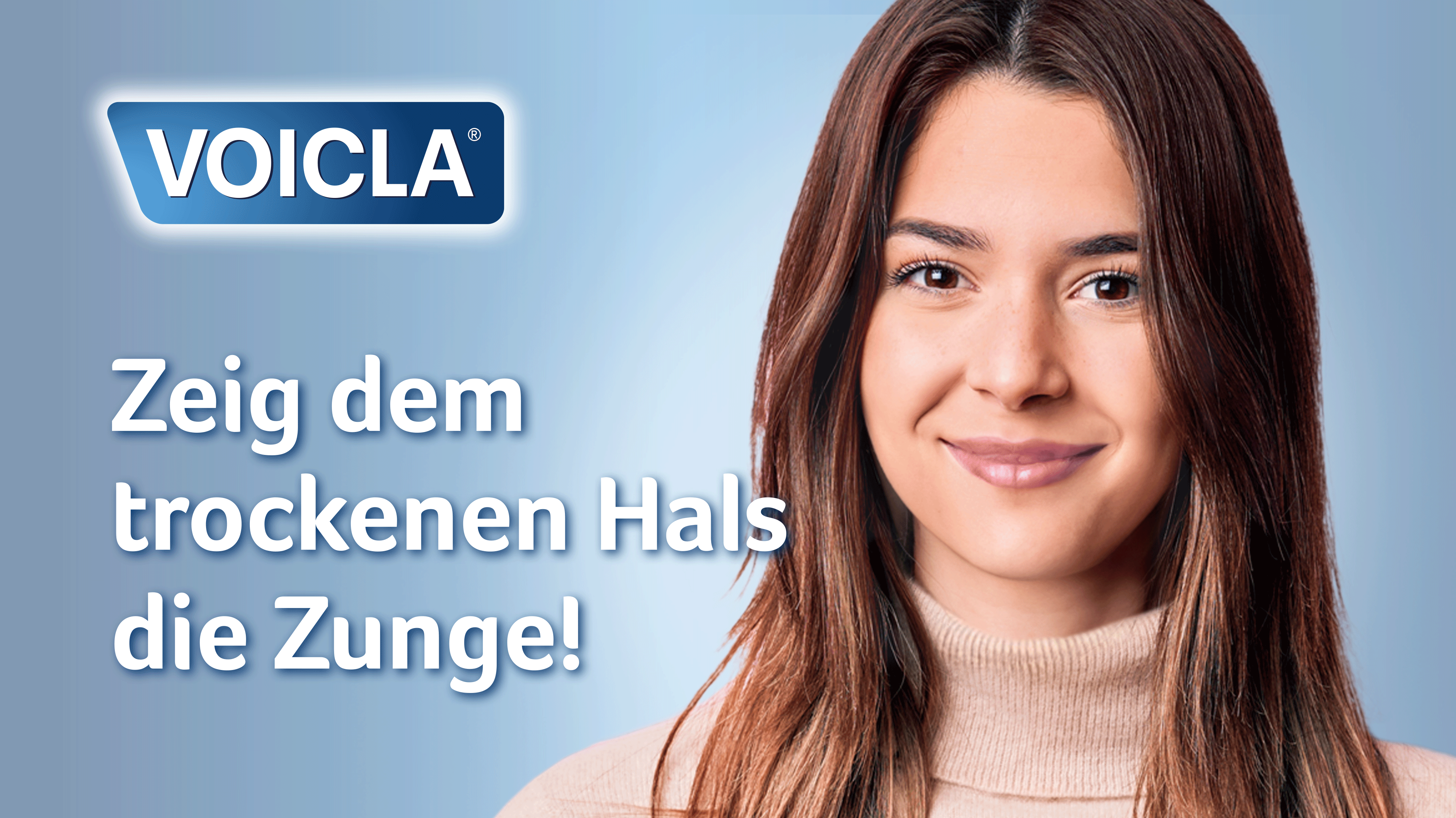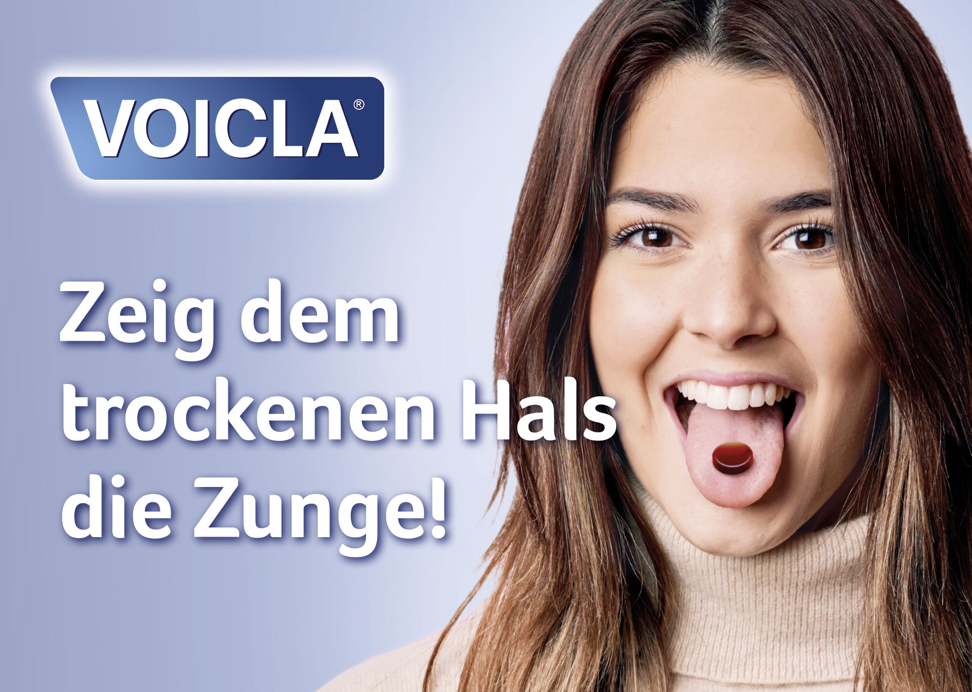 Mit humorvollen ansprechenden Sujets zeigen Presenter aus verschiedenen Zielgruppen, wie sie dank VOICLA “dem trockenen Hals die Zunge zeigen”. Diese visuell starken Kampagnenbilder sind sowohl am POS in Apotheken als auch in Print- und Online-Medien präsent.