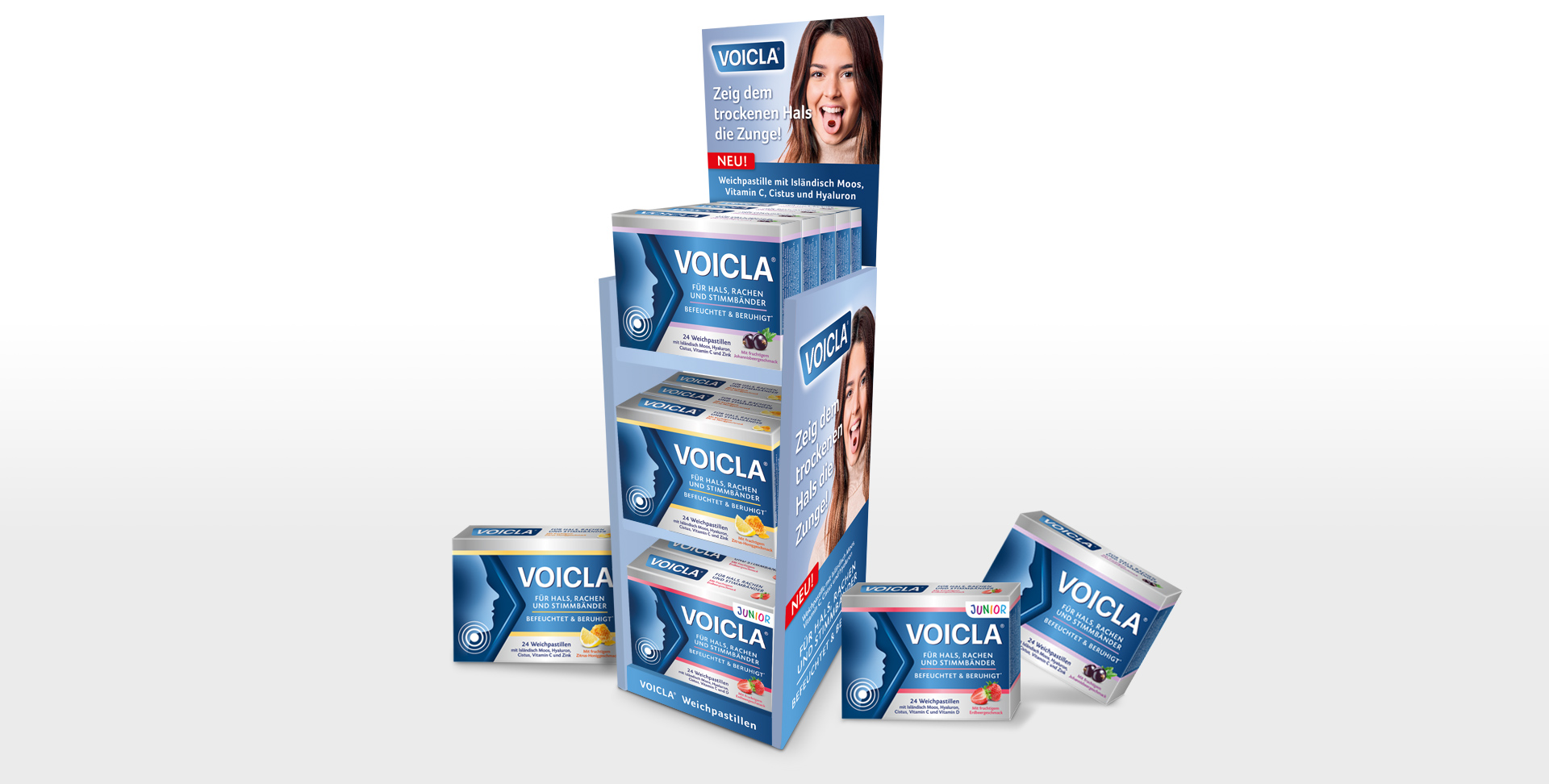 Das Ziel: VOICLA als unverwechselbaren Block deutlich sichtbar zu machen und die Aufmerksamkeit der Konsumenten als auch des Apothekenpersonals auf sich zieht.