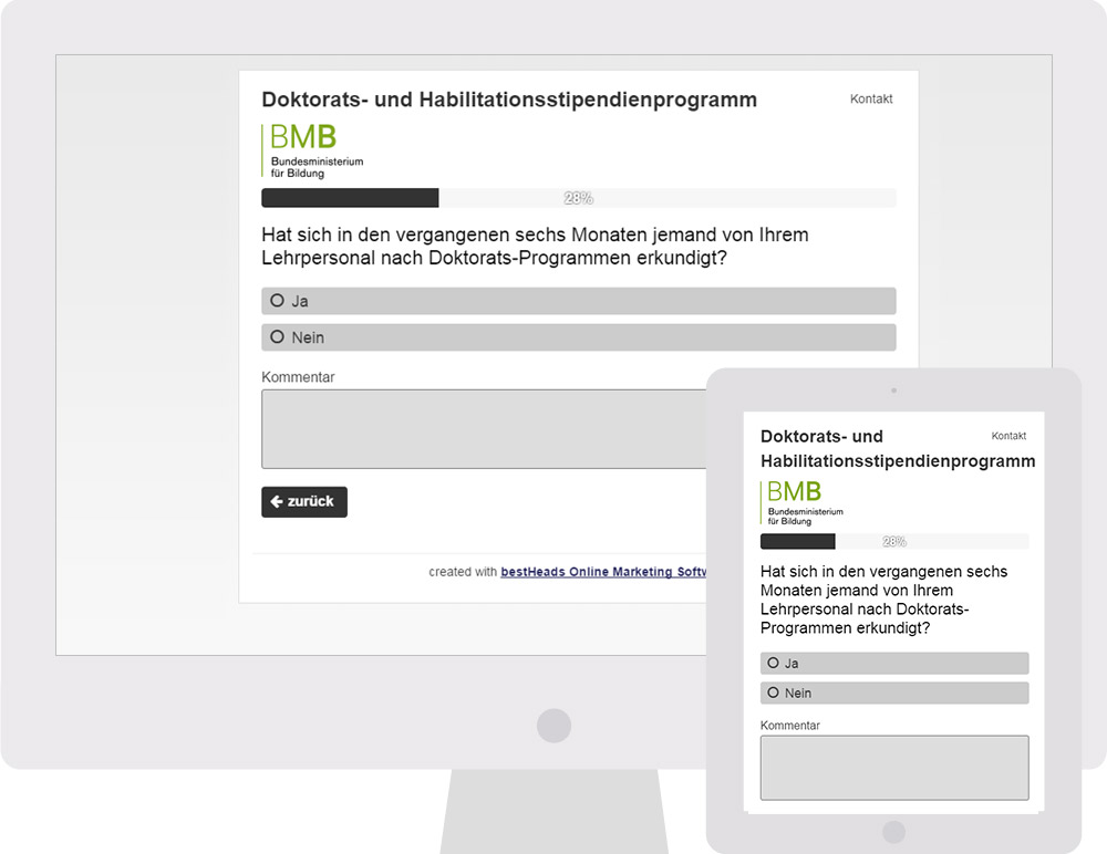 bestHeads wickelte mit dem Umfragemodul die komplette Online-Befragung eines Stipendienprogramms ab: Adressmanagement, Mailaussendung, Reminder, Auswertung.