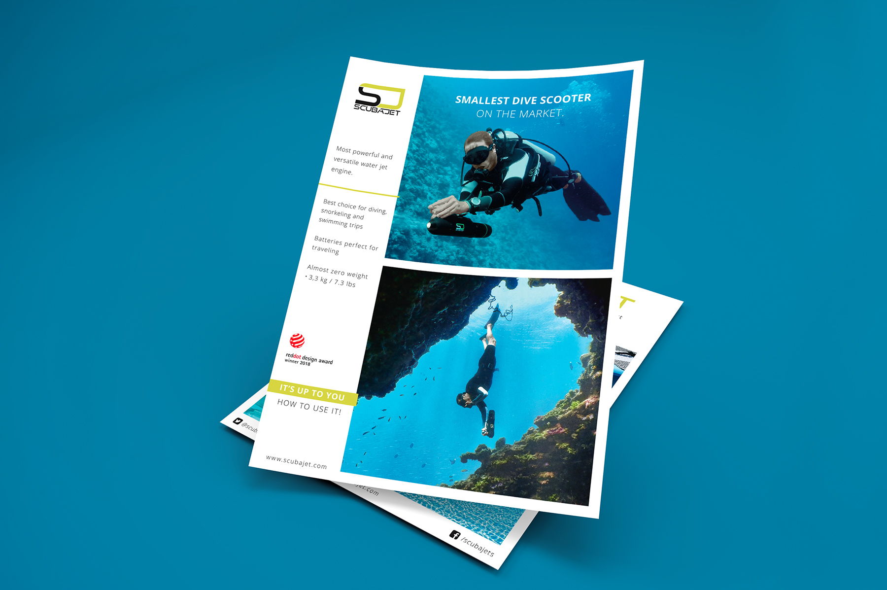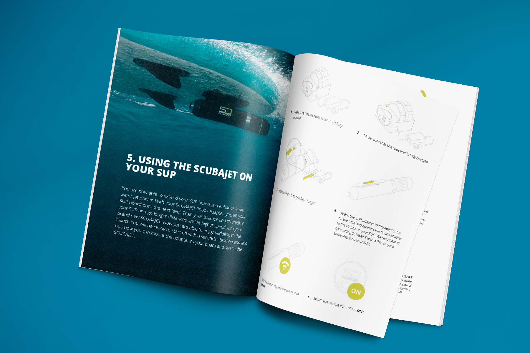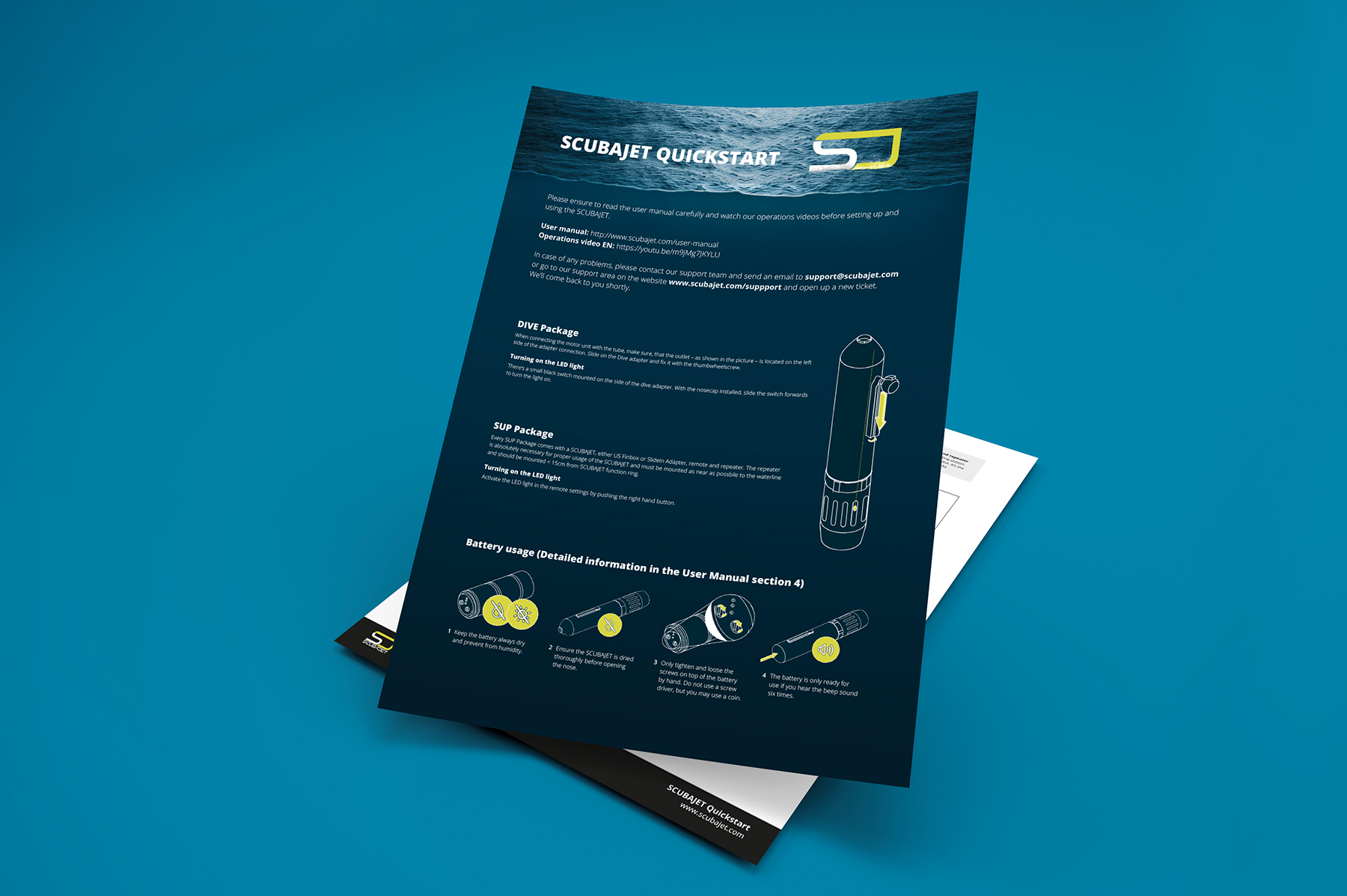 Und dass wir nicht nur Digital können, durften wir in diesem Projekt ebenfalls unter Beweis stellen. SCUBAJET war im Jahr 2017 auf vielen Messen und Demo Days in Europa und den USA unterwegs und benötigte dafür neben einem Messestand (für indoor sowie outdoor) etliche Drucksorten. Daher gestalteten wir Produktfolder, Flyer, Sticker, Roll Ups und vieles mehr. Zur finalen Auslieferung darf natürlich auch eine passende Verpackung nicht fehlen und dazu kam von uns noch ein schön designtes Benutzerhandbuch.