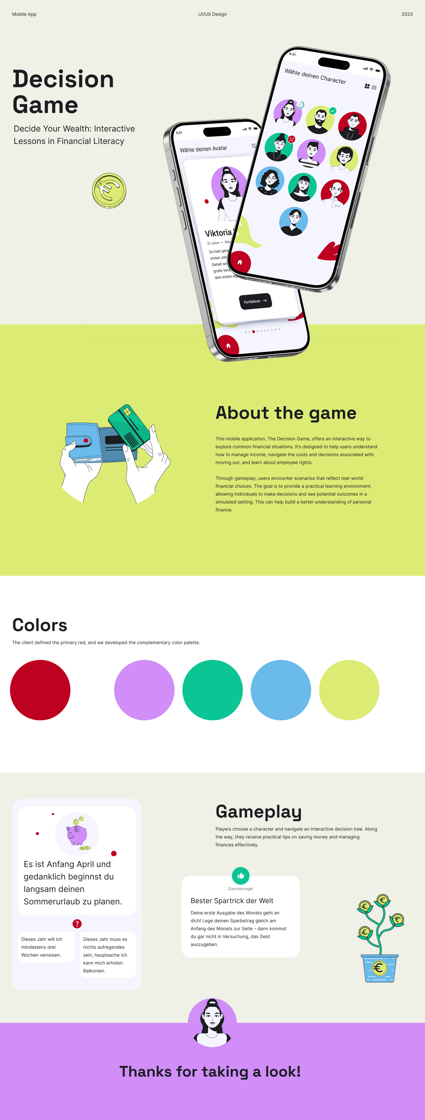 Umgesetzt wurde die preisgekrönte Serious-Game-App auf Basis von Flutter, was eine performante Nutzung auf iOS und Android garantiert. Ein intuitiver Swipe-Mechanismus kombiniert mit einem modernen, plakativen Character-Design ermöglicht es den Usern, die Konsequenzen ihrer finanziellen Entscheidungen in Echtzeit zu erleben – visuell ansprechend, spielerisch und konsequent auf Augenhöhe mit der jungen Zielgruppe gestaltet.