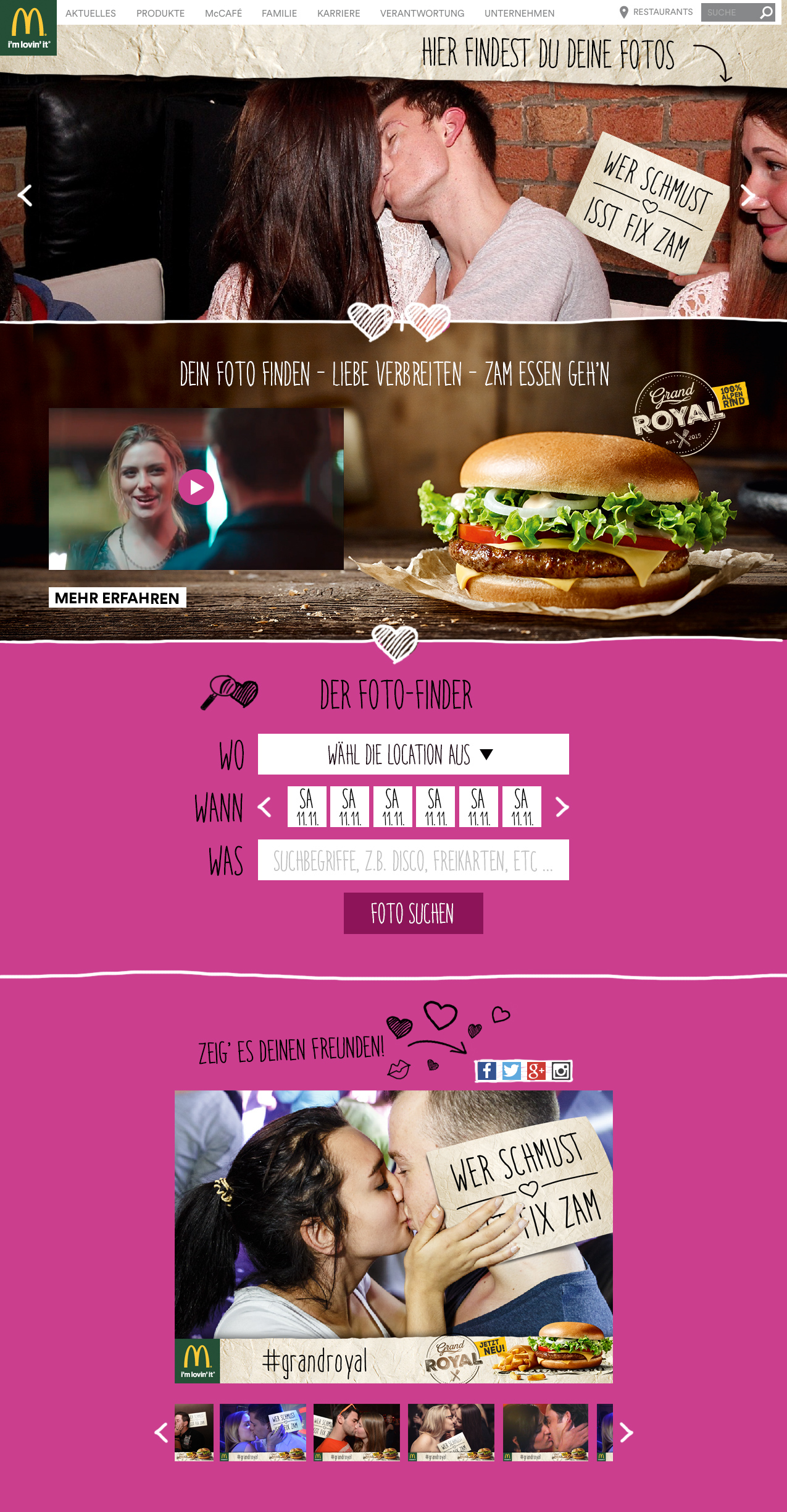 Mit dem Wissen, dass unsere Zielgruppe besonders vor und nach dem Partymachen zu McDonald’s geht, hatten wir die Idee sie beim Feiern zu begleiten. In Kooperation mit Fotographen in ganz Österreich, kamen wir auf das Konzept „wer schmust, isst fix zam“. So wurden tausende Fotos von Leuten gemacht, die am nächsten Tag auf einer extra Microsite zu finden waren.