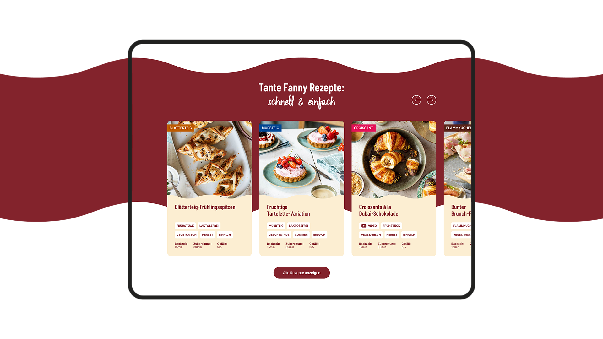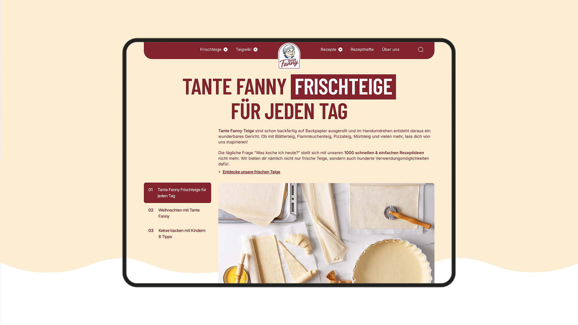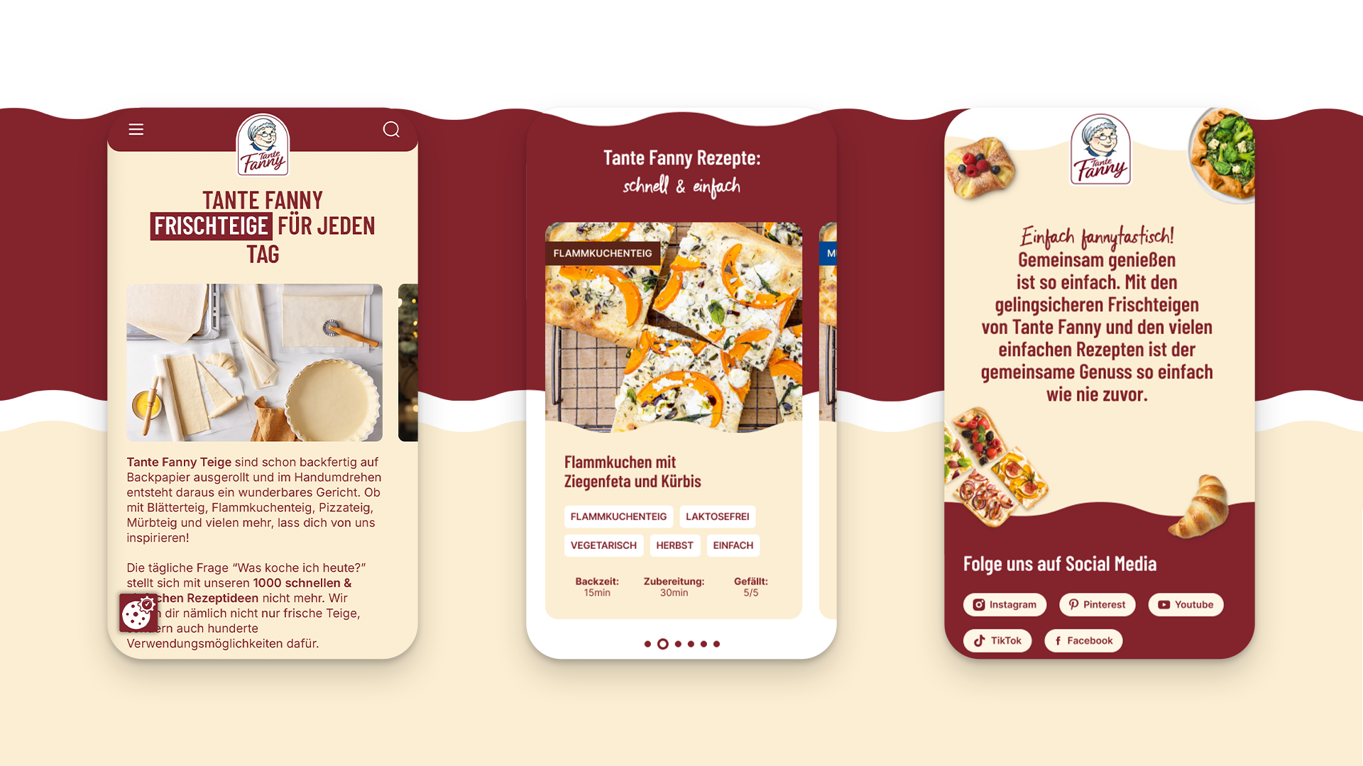 Anlass des Relaunches der Tante Fanny Website war unter anderen das Redesign der Verpackungen. Das neue Packaging sollte in die Website integriert werden, die Markenwerte stärker erlebbar gemacht und eine moderne, inspirierende User Experience geschaffen werden – inklusive Verwendung der Kategoriefarben, leistungsstarker Rezeptsuche und barrierefreier Umsetzung.