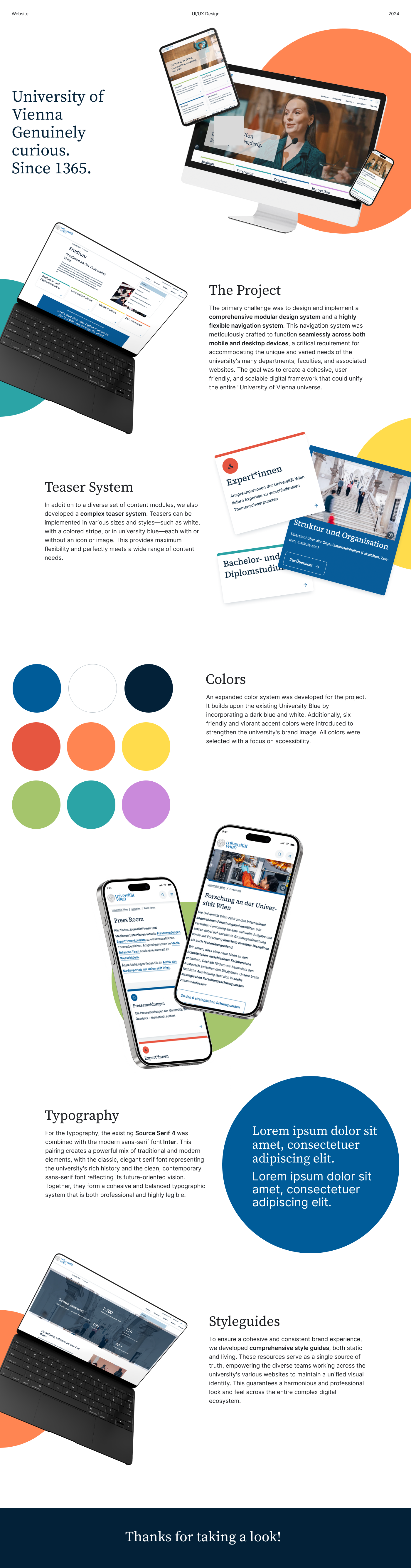 Die Herausforderung bestand darin, für die umfangreiche Webpräsenz der Universität Wien sowohl ein neues, modulares Navigationskonzept als auch ein flexibles System zur Abbildung vielfältiger Inhalte zu entwickeln. Ziel war es, eine skalierbare Struktur zu schaffen, die komplexe Informationsarchitekturen und eine modulare Startseite harmonisch vereint und dabei verschiedenste Use Cases der unterschiedlichen Institute abdeckt.