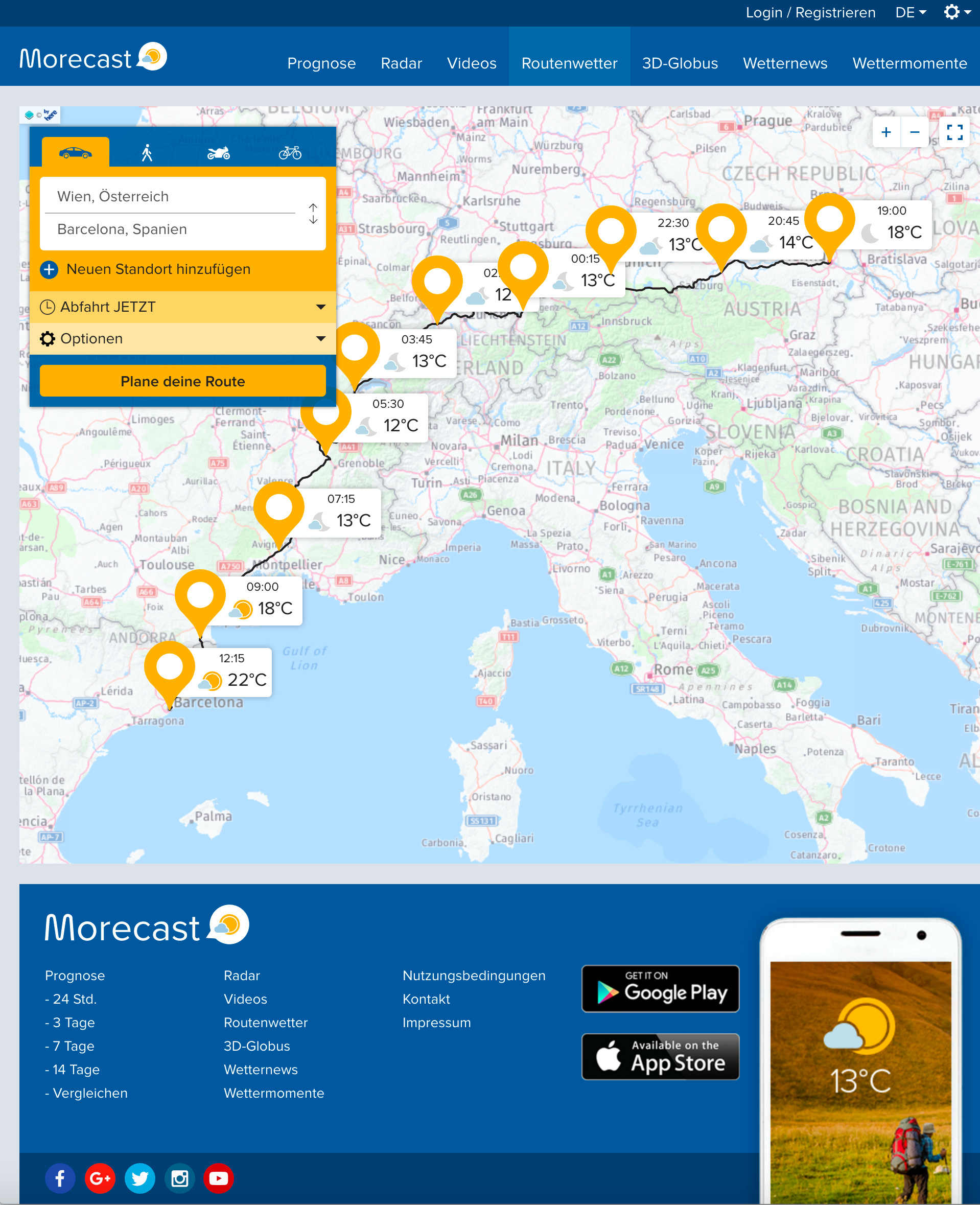 Neben den hochpräzisen Wetterprognosen für Temperatur, Niederschlag, Windgeschwindigkeit und Druck sticht die Seite durch viele spannende Features hervor. Mit der Funktion “Routenwetter” sind Auto-, Motorrad- und Radfahrer sowie Fußgänger stets perfekt informiert: Sie wissen, welche Wetterlage sie am Weg zu Ihrem Zielort erwartet und somit worauf sie witterungsbedingt achten müssen. Mit dem “Radar” Feature kann die Entwicklung von Gewitterfronten in Echtzeit beobachtet werden. User haben auch die Möglichkeit, Teil der Morcast Community zu werden und ihren persönlichen “Wettermoment” via Facebook oder Twitter zu teilen. Wetterinteressierte können unter dem Menüpunkt “Vergleichen” bis zu drei Standorte rund um den Globus miteinander vergleichen. Der “3D Globus” verschafft via Satellitenbildern einen faszinierenden Überblick über die sich ändernden Wetterfronten auf unserem Planeten.