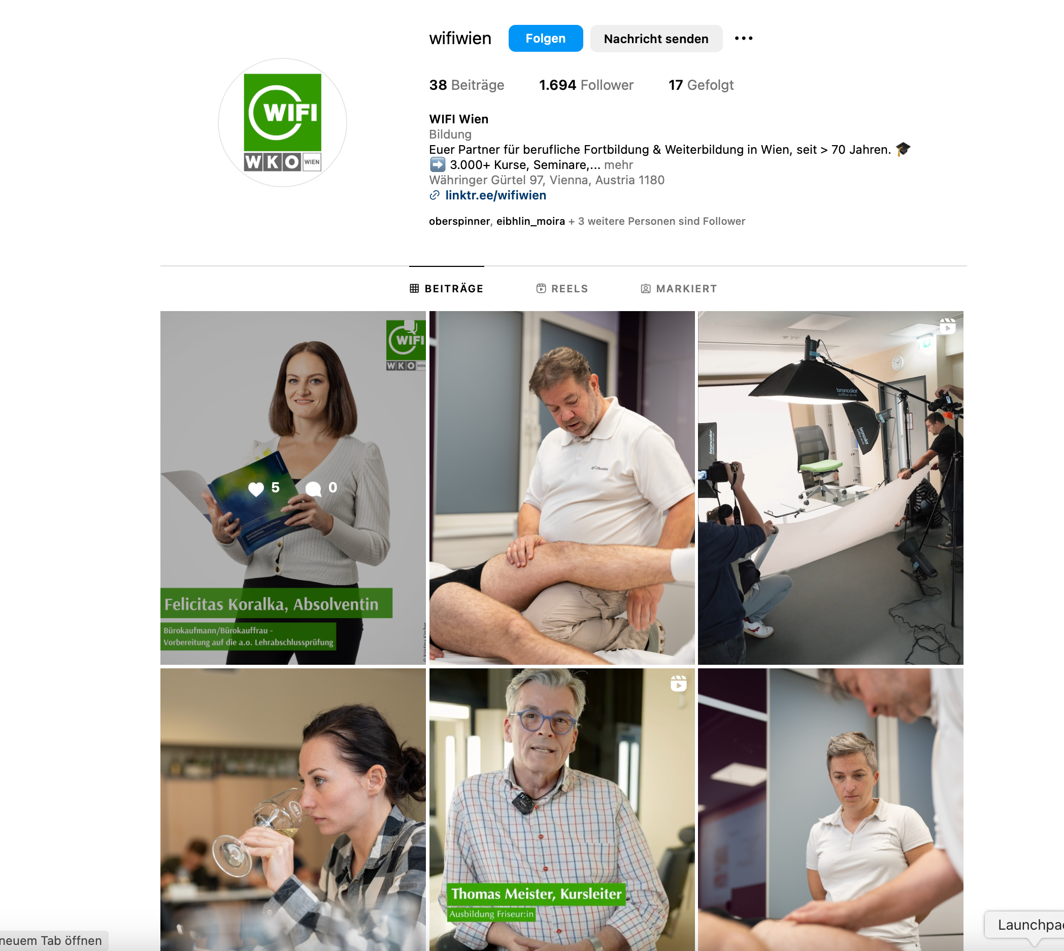 Content-Creation für 4 Kurse des Wifi Wien und ein Testimonial Event. Erstellt wurden unterschiedliche Varianten der Inhalte (Reels + Fotos) um damit den Instagram Kanal zum Leben zu erwecken. Die Inhalte wurden über 4 Monate hinweg auch mit einer Performance Marketing Kampagne begleitet, um Follower aufzubauen, Reichweite zu genieren und potentielle Kunden auf das Kursangebot des WIFI Wien aufmerksam zu machen.