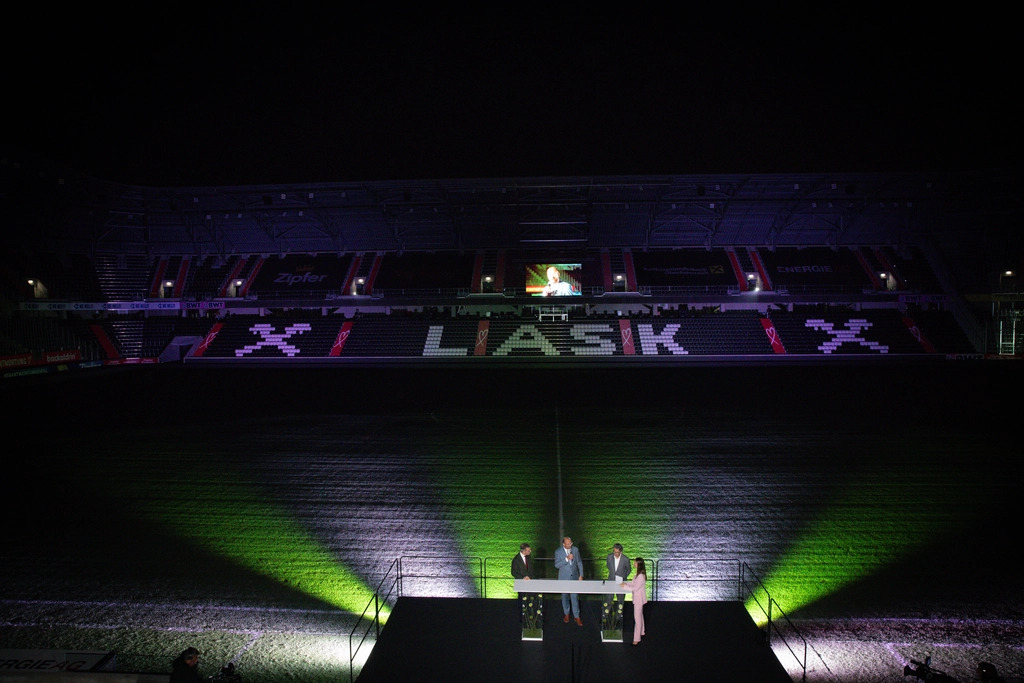 Unter dem Titel „Evergreen“ inszenierten wir in der Raiffeisen Arena eine Erlebniswelt, die Naturmuster als Metapher für organisches, langfristiges Wachstum nutzt. Ausgangspunkt war die Fibonacci-Reihe: ihre Struktur und Ästhetik wurde in die visuelle Sprache und die räumliche Führung übersetzt. Ein markant gestalteter grüner Eingang führte die 520 Gäste in die Markenwelt und setzte den Ton bereits beim Ankommen. Als dramaturgischer Höhepunkt positionierten wir die Premiere des neuen Imagefilms im Außenbereich des Stadions. Eine begleitende Lichtshow verstärkte die Motive Wachstum und Beständigkeit und machte den Jubiläums-Moment auch räumlich spürbar – als klarer Abschluss eines Abends, der Nachhaltigkeit und langfristige Perspektiven konsequent zusammenführt.