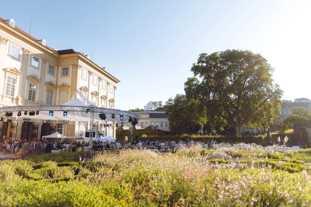 Wir setzten das Jubiläum im Gartenpalais Liechtenstein Wien als elegantes Abendformat um und nutzten die barocke Architektur sowie den weitläufigen Garten für eine klare Eventlogik aus Ankommen, Programm und Austausch. Der Ablauf wurde so gestaltet, dass Reden und die Ansprache des Vorstands als inhaltliche Fixpunkte wirken, ohne den Abend zu dominieren: präzise Timing- und Übergangsregie, abgestimmte Licht- und Tonführung sowie eine dramaturgisch passende Einbettung in das Dinner-Setting. Musikalische Beiträge setzten emotionale Akzente zwischen den Programmpunkten. Kulinarik und Service wurden auf einen fließenden Gästeflow ausgerichtet, während der Garten als hochwertige Networking-Zone den Sommerabend verlängerte und Gespräche in entspannter Atmosphäre ermöglicht hat.