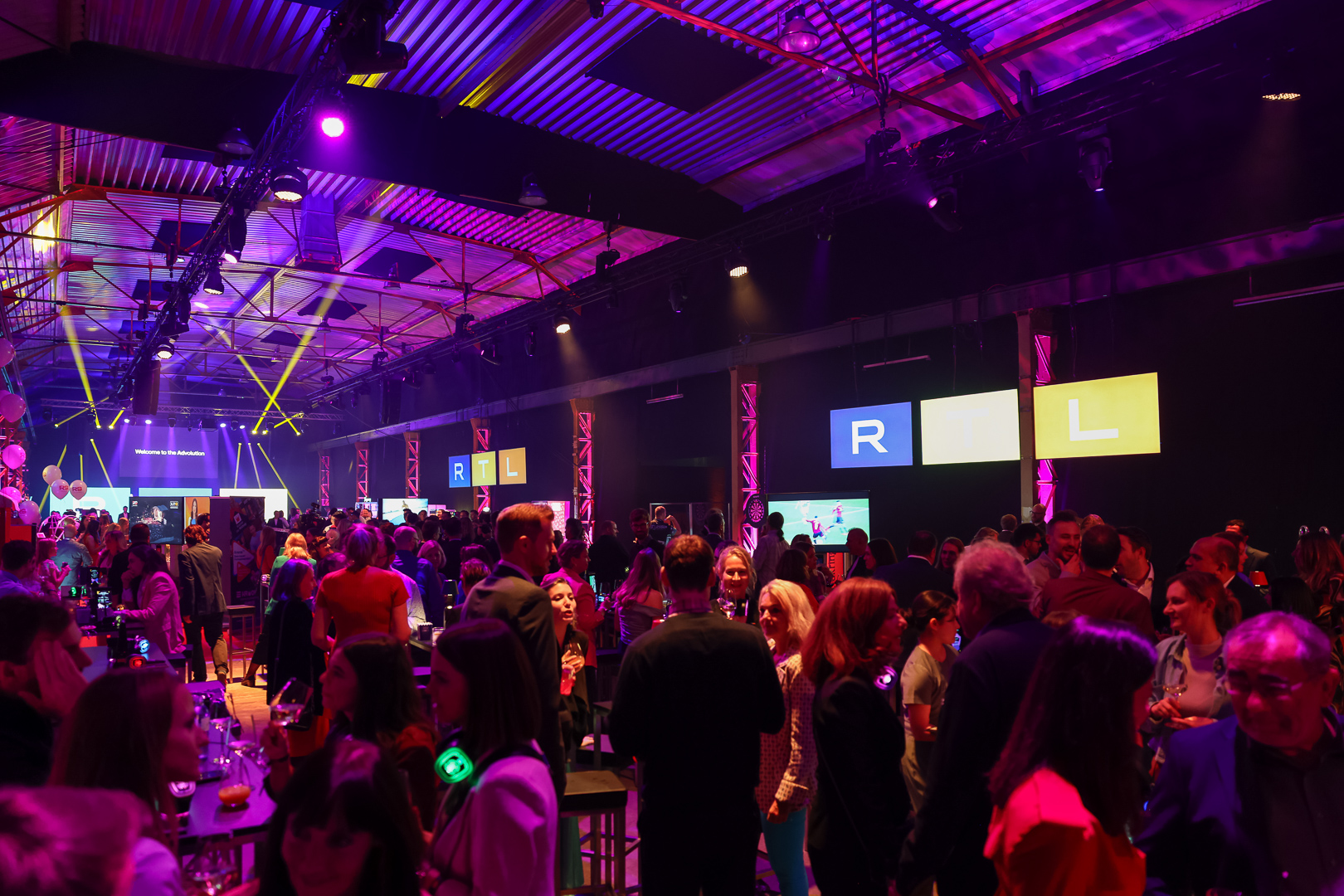 Wir entwickelten ein „Content on demand“-Erlebnis in den Wiener Werkshallen: eine offene Landschaft aus unterschiedlich gestalteten Areas mit über 30 Screens, auf denen Gäste Programmteile je nach Interesse konsumieren konnten – in der Lounge, im Gespräch oder sogar beim Tätowieren. Für fokussiertes Zuhören setzten wir eine Silent Conference um: Kopfhörer ab dem Eingang, klar definierte Audio-Kanäle und ein reibungsloser Wechsel zwischen Content und Networking. Visuelles Zentrum war die Markeninszenierung über drei mobile LED-Wände, die zunächst das neue RTL-Logo formten, sich zu einer großen LED-Wall zusammenschoben und später beim DJ-Set ins Publikum fuhren. Foodtrucks und Giulia Siegel schlossen den Abend ab.