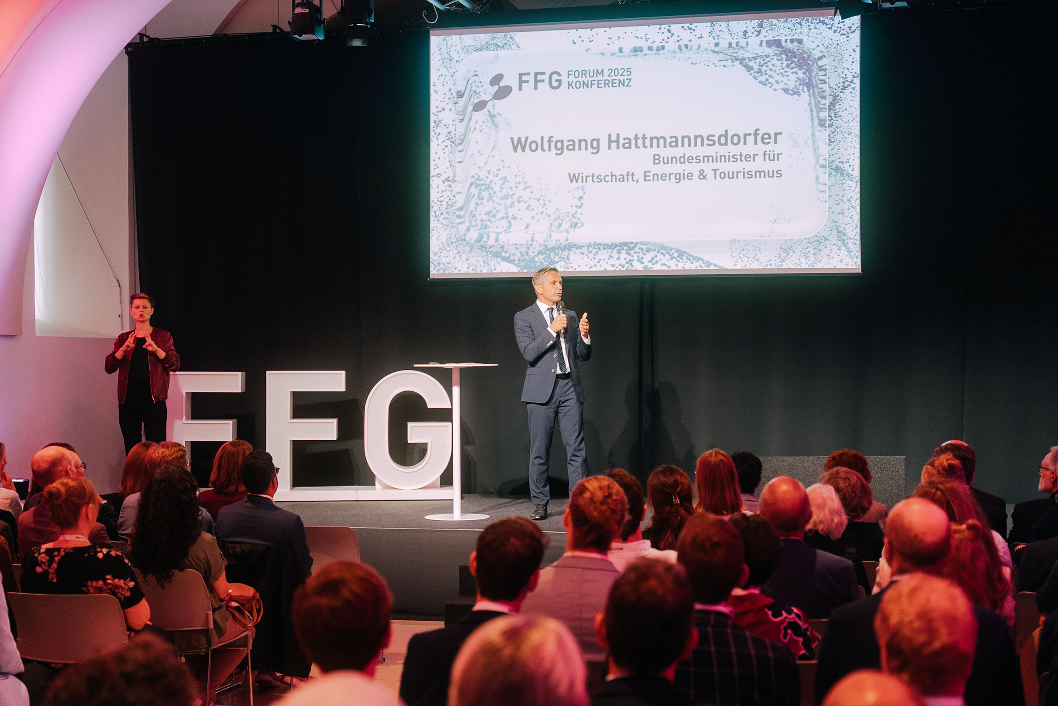 Wir setzten das Forum als zweigeteiltes Gesamtformat um: Die Nachmittagskonferenz wurde mit einer klaren thematischen Klammer über die sechs Technologiefelder strukturiert und von Bundesminister Wolfgang Hattmannsdorfer eröffnet. Für den Abend entwickelten wir eine Gala-Dramaturgie, die den inhaltlichen Bogen wieder aufnimmt: Gertrude Tumpel-Gugerell sowie die FFG-Geschäftsführerinnen Henrietta Egerth und Karin Tausz begrüßten die Gäste; Bundesminister Peter Hanke verdichtete die Erkenntnisse aus dem Nachmittag. Als inhaltliches Highlight positionierten wir den Beitrag von Klemens Özelt (AI-Artist) zur KI in der Kreativwirtschaft. Andi Knoll führte pointiert durch den Abend und hielt Energie sowie Übergänge stabil.
