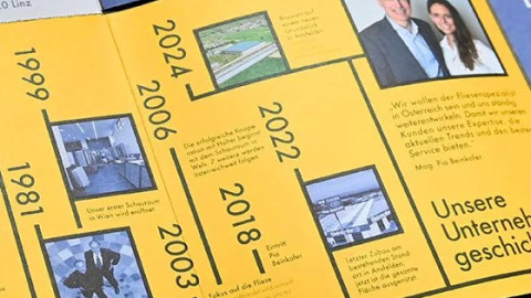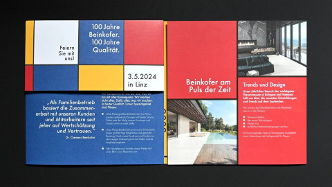 Der Fliesenspezialist gibt dem Jubiläum eine Bühne und lädt zum Jubiläumsevent. Dabei entdeckten wir Parallelen zu einer berühmten Epoche. Die Gründung von Beinkofer (1924) fällt genau in die Bauhaus-Zeit, eine von Walter Gropius gegründete Kunstschule (1919-1933). Der Bauhaus-Stil mit seiner charakteristischen Formensprache und typischen Farben (Rot, Gelb, Blau) prägt auch das Beinkofer Corporate Design. Weil die Resonanz von Bauhaus bis heute anhält, knüpften auch wir das 100-Jahre-Jubiläum daran an. Wir nutzten das Jubiläum zur Imageauffrischung und gestalteten einen Unternehmensfolder mit inkludierter Einladung, sowie POS-Material und Social Media Maßnahmen, in der klaren, geometrischen Design- und Formensprache. Zudem setzten wir einen Imagefilm um, der das traditionsreiche Unternehmen in die heutige Zeit holt.