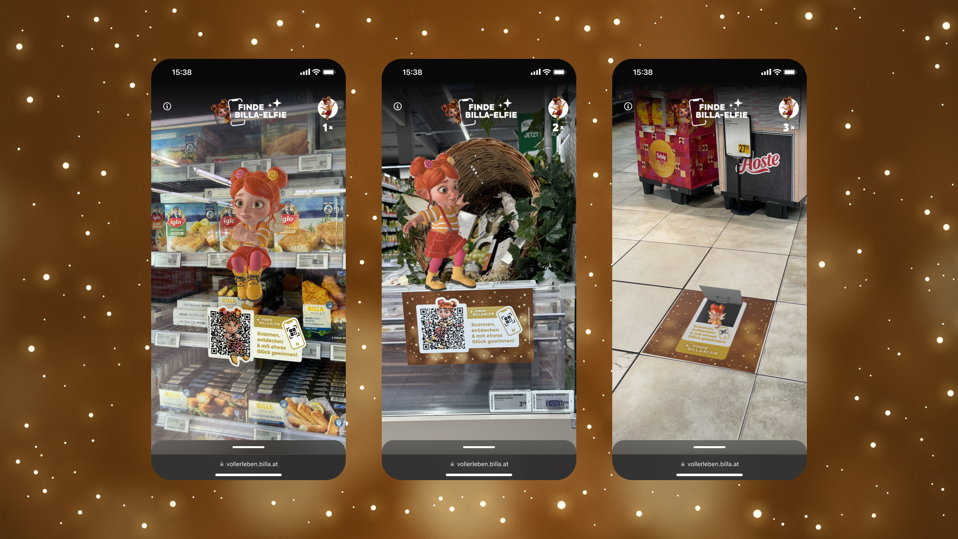 Im Zentrum des Konzepts steht ein cleveres AR-Spiel, mit dem wir die BILLA-Elfie zum Leben erwecken. In allen BILLA und BILLA Plus Filialen in Österreich wurden liebevoll designte QR-Codes platziert, die Kund:innen ganz einfach mit der Smartphone-Kamera scannen können. Jeder QR-Code lässt eine eigene 3D-Animation der BILLA-Elfie mittels Augmented Reality Technologie erscheinen – mal versteckt sich Elfie im Kühlregal, am Merchandising-Aufsteller oder als Bodenmarkierung. Wer drei BILLA-Elfie Codes entdeckt und scannt, kann zusätzlich an einem attraktiven Gewinnspiel teilnehmen.
