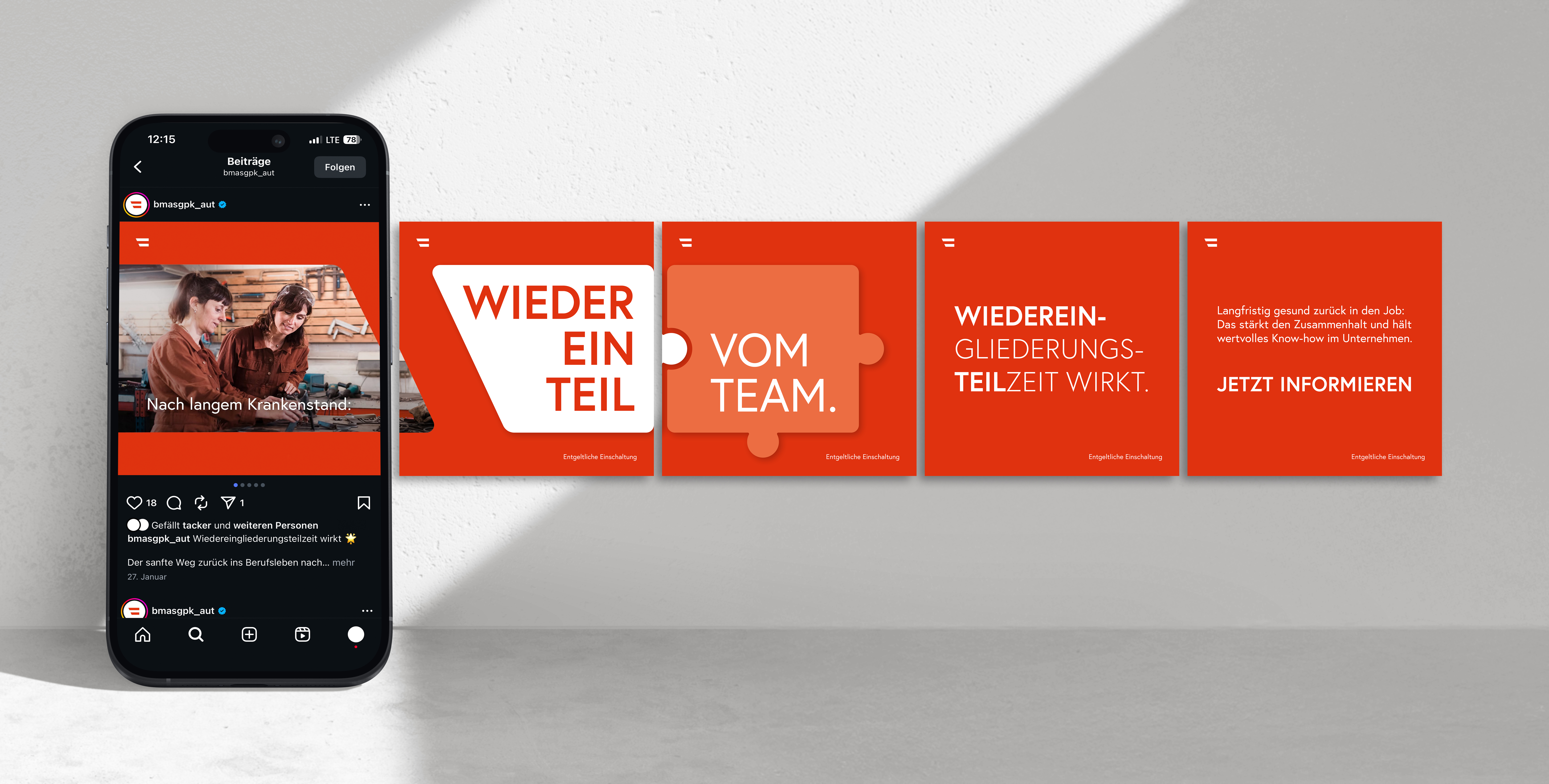 Ein bürokratischer Name wird zum motivierenden Motto: Um die Maßnahme bei allen Zielgruppen bekannter zu machen, haben wir eine Kampagnenwelt entwickelt, die den komplexen Begriff „Wiedereingleiderungsteilzeit“ mit einem motivierenden Wording einfach verständlich macht und emotional auflädt. In Kombination mit einem Design und einer Bildwelt, die das positive Gefühl der schrittweisen Rückkehr in den Job visuell unterstreichen, wird auf Social Media, Stakeholder-Plakaten, in Advertorials und in Spots sofort klar: Mit der Wiedereingliederungsteilzeit werden Menschen langfristig gesund „Wieder ein Teil vom Team.“