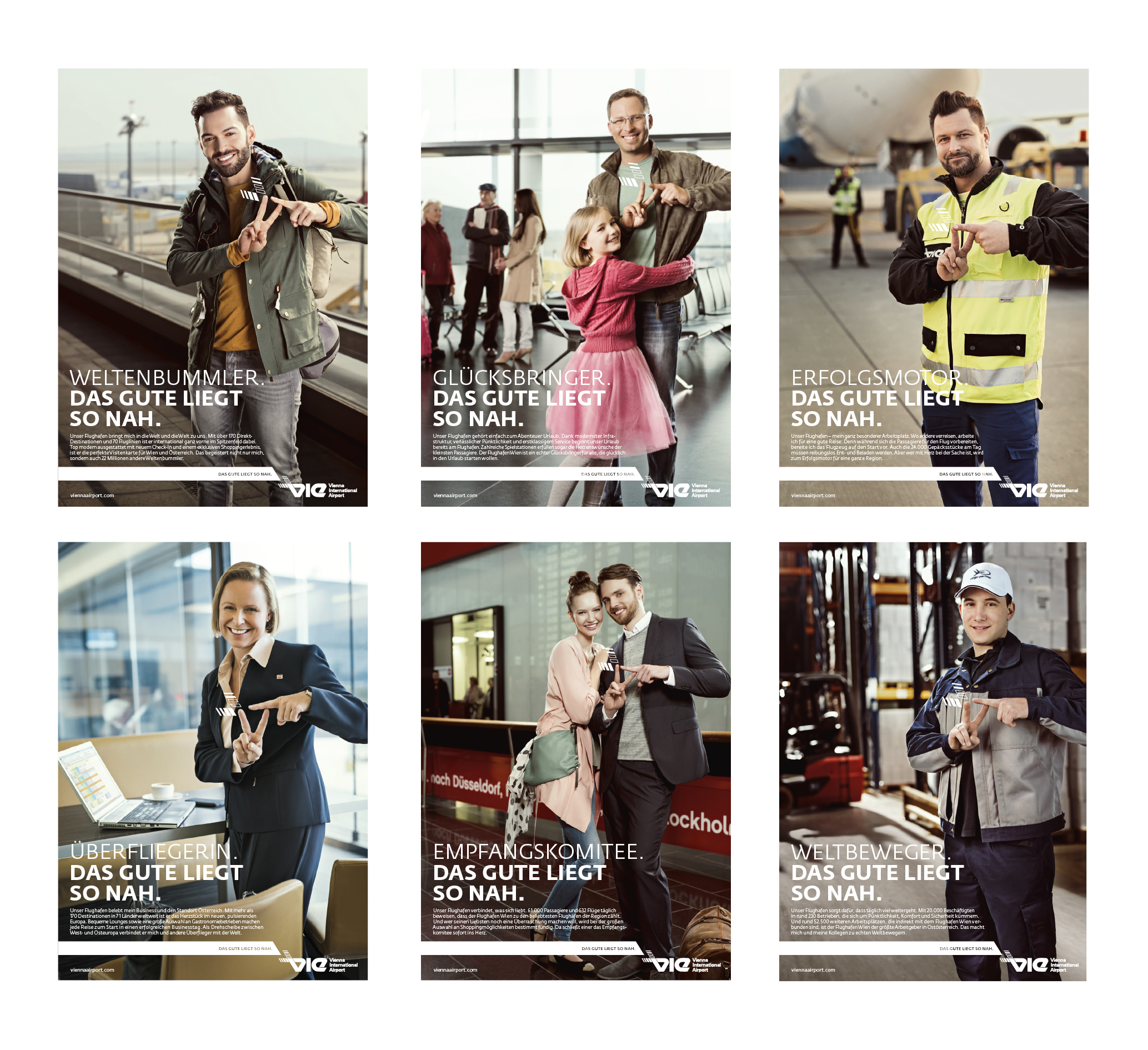 Mit Herzblut gedacht. Zur Herzensangelegenheit gemacht: Die Idee der PKP BBDO-Kreativen. Sie entwickelten ein Zeichen, das leicht von der Hand geht und alle Beteiligten ganz einfach zum Teil der Kampagne macht: Groß und Klein, Flughafenmitarbeiter und Wirtschaftstreibende, Vielflieger und Einfachreisende, Anrainer und Anreisende. Sie alle bekennen sich stolz zum Flughafen Wien: Hand aufs Herz, mit den Fingern das – dem „Victory“ ähnliche – VIE-Logo bildend. So einfach bringt man auf den Punkt, warum „das Gute so nahe liegt“.“