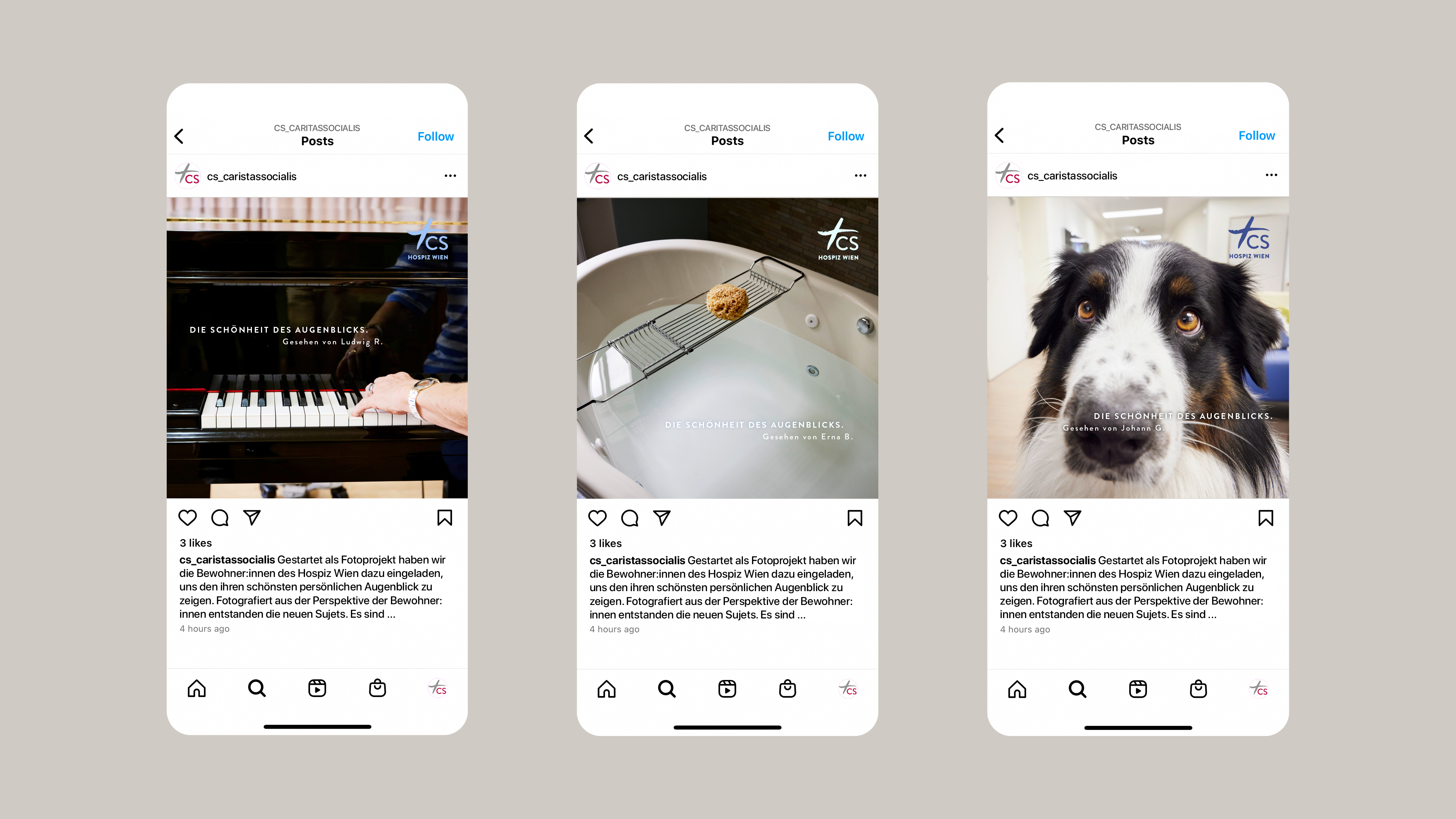 Gestartet als Fotoprojekt wurden die Bewohner:innen dazu eingeladen, uns den ihren persönlichen Augenblick zu zeigen, der dann aus ihrer Perspektive fotografiert wurde. Hier entstanden die neuen Sujets, der tägliche Lieblingscocktail, das Lieblingslied am Piano, ein Vollbad, der rote Lippenstift. Haustiere streicheln, barfuß durch das feuchte Gras gehen. Vermeintlich kleine Begegnungen und Taten, doch aus dem Blickwinkel der Gäste so groß und bedeutsam. Jedes Sujet wurde mit dem Vornamen des jeweiligen Bewohners:in versehen, um den persönlichen Augenblick zu verstärken.