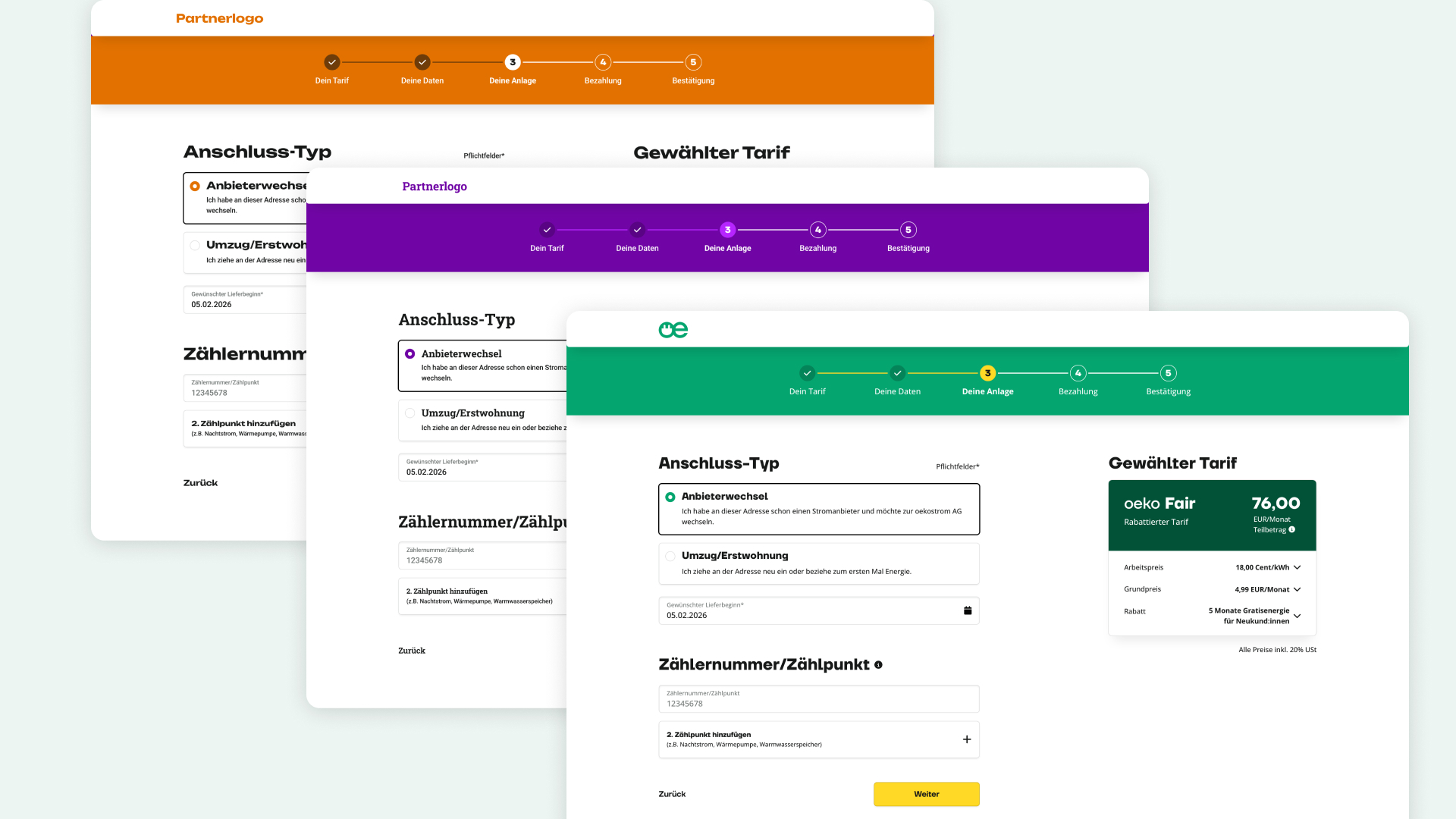 Für die oekostrom AG, Österreichs Pionier für 100 % grünen Strom, haben wir eine flexible White Label-Wechselstrecke entwickelt, die nahtlos in die Markenwelt von Vertriebspartnern integriert werden kann. Dadurch erleben Kund:innen den Wechselprozess vollständig im Look & Feel ihres bekannten Partners – für mehr Vertrauen und höhere Abschlussraten.