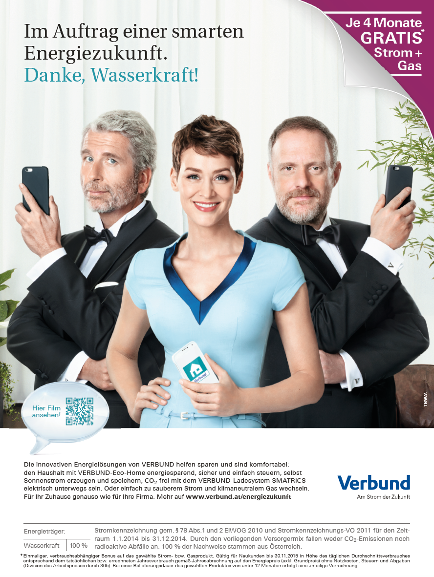 Neben dem Comedy-Duo Stermann & Grissemann, die in der Kampagne die Konsumenten repräsentieren, wird ein weiteres Testimonial eingeführt: die attraktive „V“, die die Rolle des Unternehmens übernimmt. Sie bringt die klugen, zukunftsweisenden Lösungen und schafft damit den Imagetransfer zu VERBUND.