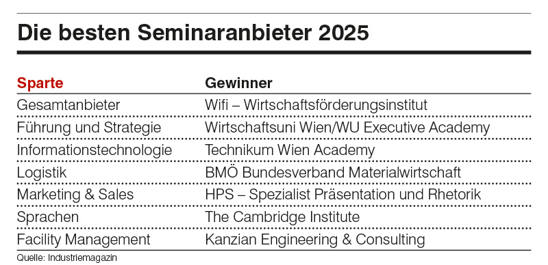 „Unternehmen wünschen sich Wissensvermittlung, die sofort im Tagesgeschäft umsetzbar ist. Erfahrene Trainer sind ebenso gefragt wie gut aufbereitete Unterlagen, die die praktische Anwendung im Arbeitsalltag unterstützen”, erklärt Herbert Kling, Geschäftsführer von brandscore.at. Kling ist verantwortlich für die Umfrage, die das Industriemagazin auch 2025 wieder in Auftrag gegeben hat. Befragt wurden 250 HR-Entscheider sowie 250 Mitarbeitende und Seminarbesucher.