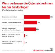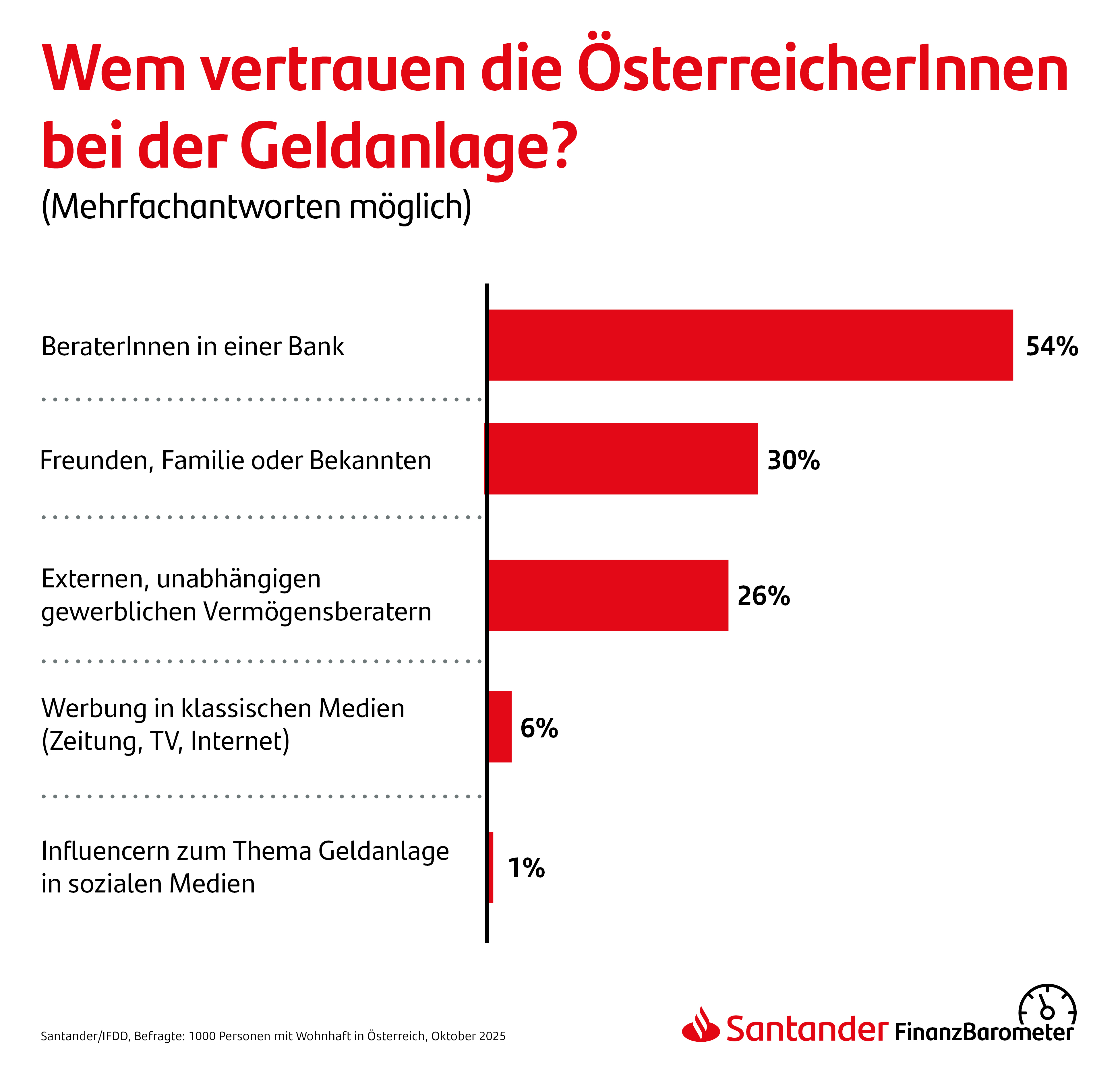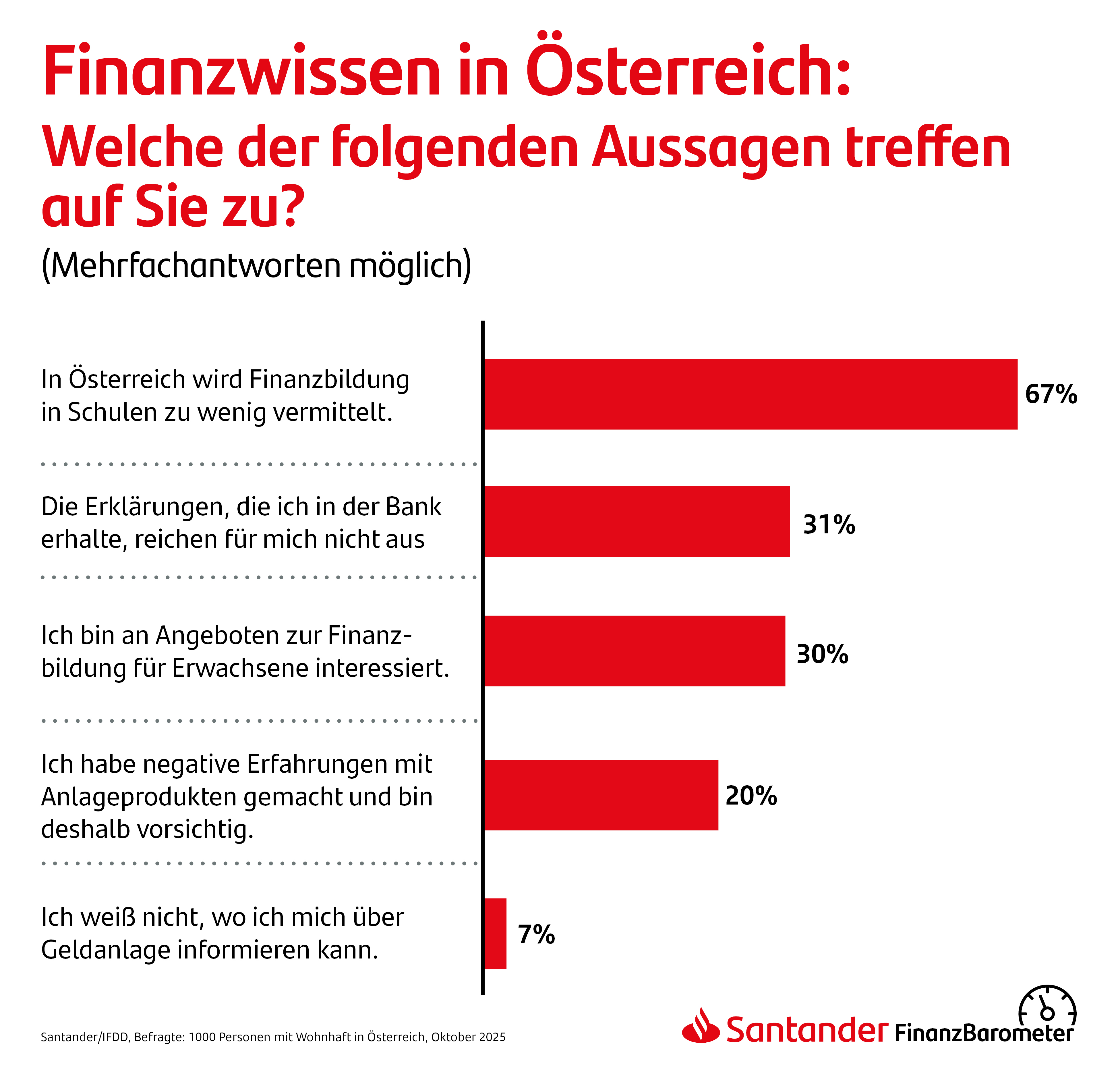 Das Santander-Finanzbarometer liefert regelmäßig Einblicke in das Finanzverhalten der Österreicherinnen und Österreicher. Die vorliegende repräsentative Erhebung für die neue Ausgabe wurde vom 2. bis 5. Oktober 2025 vom Institut für Demoskopie und Datenanalyse (IFDD) im Auftrag von Santander durchgeführt. Befragt wurden 1000 Personen mit Wohnort in Österreich. Die Schwankungsbreite beträgt 3,1 Prozent.