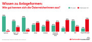 Bei einer Anleihe wissen über 60 Prozent „weniger gut“ oder „gar nicht“ Bescheid, wie dieses Produkt funktioniert. Ein ähnliches Bild zeigt sich bei Aktien: Hier kennt sich mehr als die Hälfte der Befragten nicht gut aus. Unterschiede gibt es je nach Bildungsabschluss: Bei den Befragten, die Matura haben, gibt etwa jeder Zweite an, über Anleihen „sehr gute“ oder „gute“ Kenntnisse zu haben, bei Aktien sind es knapp 60 Prozent.