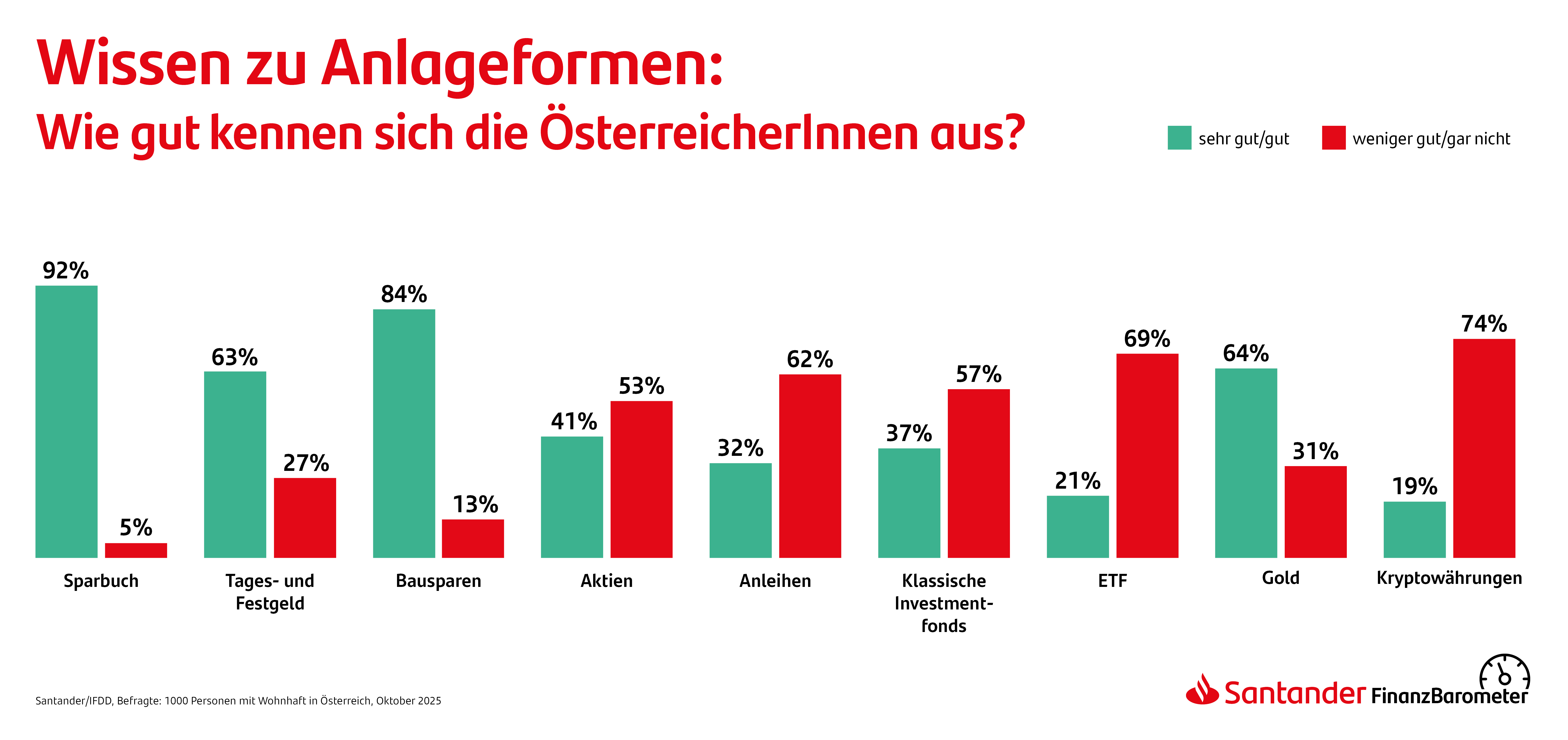 WIEN. Der Weltspartag naht, und es zeigt sich wieder einmal, dass abseits vom Sparbuch beim Finanzwissen in Österreich noch viel Luft nach oben ist. Das neue Santander-Finanzbarometer, basierend auf einer aktuellen Umfrage unter eintausend Personen, zeigt große Lücken bei den Kenntnissen um alle anderen Anlageformen auf. „Da sind auch die Banken gefordert, bei der Beratung darauf Rücksicht zu nehmen,“ meint Olaf Peter Poenisch, CEO von Santander Österreich. „Bei der Finanzbildung ist in Österreich viel Luft nach oben. Idealerweise wirken bei der Vermittlung von Finanzwissen Elternhaus, Schulen und Banken zusammen.“