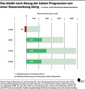 Die Berechnung beruht auf der Annahme, dass die Gehälter bis zur Steuerreform 2021 mit der Inflationsrate steigen werden. Damit würden Arbeitnehmer mit 2.000 Euro Monatsbrutto um neun Prozent mehr verdienen, aber um 37,4 Prozent höhere Steuern bezahlen als 2016. Die kolportierte Senkung der unteren drei Steuerstufen würde in diesem Fall eine Entlastung um 422 Euro pro Jahr bringen, die Belastung durch die kalte Progression wäre mit 471 Euro aber höher.