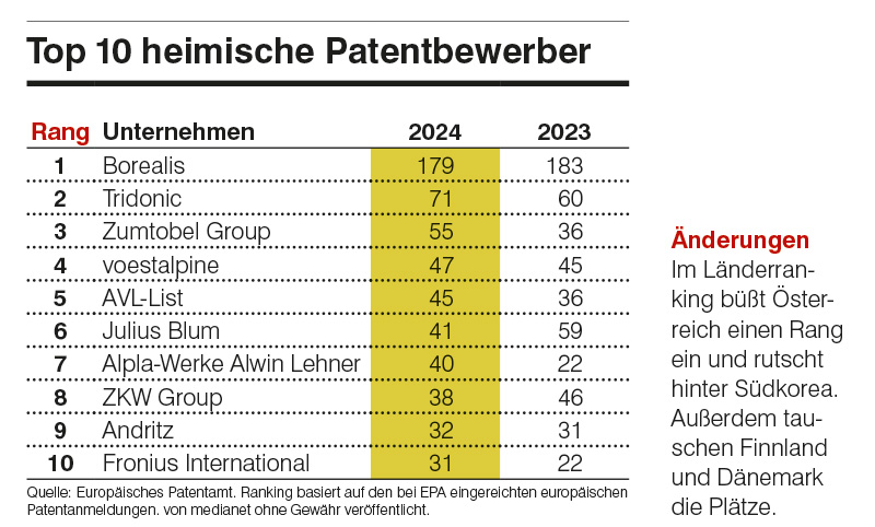 Im Europäischen Patentindex 2024 führt Borealis (179) das heimische Feld vor Tridonic (71) und der Zumtobel Group (55) an.