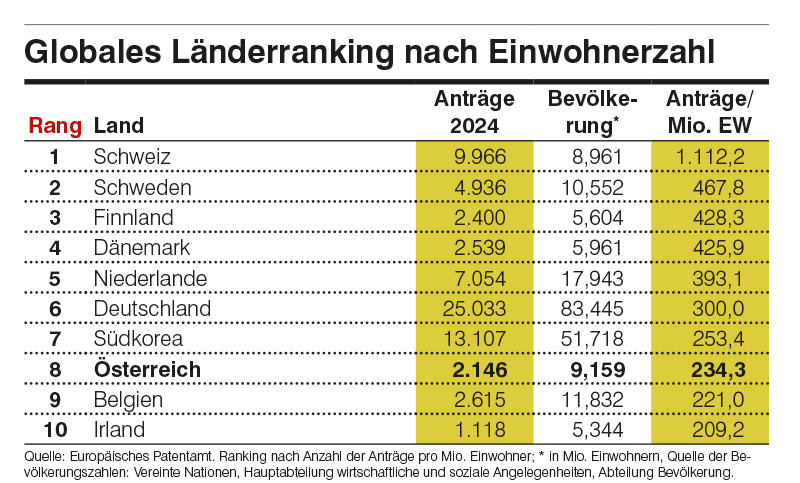 WIEN. Aus dem Jahresbericht des Österreichischen Patentamtes geht hervor: Die höchste Zahl der Erfindungen verzeichnet Oberösterreich. Dort waren es 2024 insgesamt 503 technische Innovationen. Platz zwei belegt die Steiermark mit 451 Erfindungen. An dritter Stelle liegt Wien, das mit 395 Erfindungen einen massiven Zugewinn von 13,5% verbuchen kann.