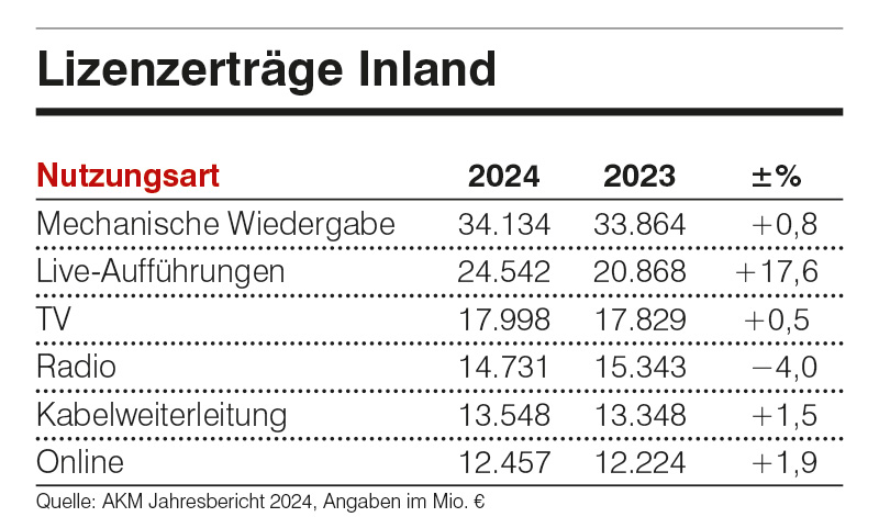 WIEN. Die AKM, Österreichs Verwertungsgesellschaft für Musikschaffende und Musikverlage, hat das Geschäftsjahr 2024 mit einem deutlichen Plus abgeschlossen. Insgesamt schüttete die AKM rund 125 Mio. € an ihre 28.000 Mitglieder aus – ein Anstieg von 4,4% gegenüber dem Vorjahr, auch durch Lizenzerträge, die sich auf insgesamt 131,15 Mio. € beliefen und damit um 3,4% höher lagen als 2023.