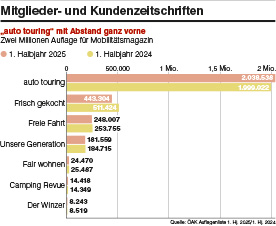 WIEN. Einen Höhenflug weisen die aktuellen ÖAK-Zahlen vom ersten Halbjahr 2025 auto touring, dem Mobilitätsmagazin des ÖAMTC aus – so konnte seine Auflage nicht nur einmal mehr steigern, sondern knackte außerdem die Zwei-Millionen-Marke. Demnach liegt die verbreitet Auflage des Magazins bei 2.038.538 und damit um 39.516 Stück höher als im Vorjahr. Im ersten Halbjahr 2024 erreichte auto touring laut ÖAK eine verbreitete Auflage von insgesamt 1.999.022.