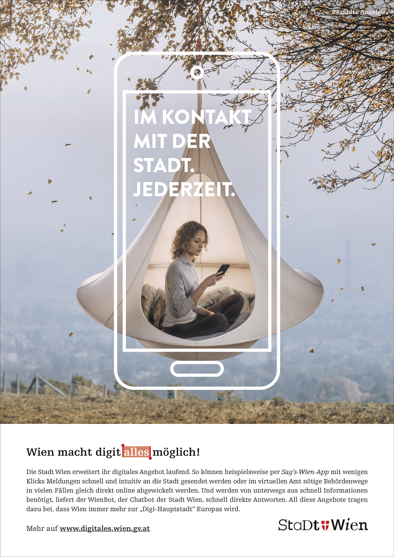 WIEN. Auf dem Weg zur digitalsten Hauptstadt Europas setzt die Stadt Wien auf digitale Services und wird damit dem Wunsch der Wiener nach mehr Transparenz, Mitgestaltung, Unabhängigkeit und Convenience gerecht. Mittels verschiedener Apps kann man von unterwegs Amtswege schneller erledigen, die neuesten Infos aus Wien abrufen oder Anliegen direkt im Rathaus einbringen. Diese Services zeigt die Kampagne von DMB., die derzeit in zahlreichen Print- und Onlinemedien zu sehen ist. Der neu entwickelte Claim,„Wien macht „digitalles“ möglich“, bringt es auf den Punkt.