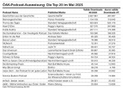 Verglichen mit dem April 2025 bleibt die Reihenfolge der Podcasts unverändert, der Vergleich mit dem Jahresschnitt 2024 zeigt aber einige Veränderungen: „Hawi D’Ehre“, 2024 noch auf Platz drei, rutscht auf den vierten Platz. Die beiden Investigativ-Podcasts „Inside Austria“ (Standard) und „Die Dunkelkammer“ (DasKollektiv) schieben sich vor „Erklär mir die Welt“ von Andreas Sator, der damit im Mai 2025 auf Platz sieben rangiert. Der Standard-Podcast „Besser Leben“ – 2024 noch nicht von der ÖAK ausgewiesen – liegt auf Platz acht.