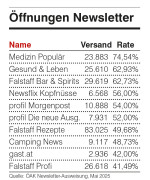 Deutlich höhere Öffnungsraten bescheinigt die ÖAK dagegen den Newsletter „Medizin Populär“ (74,54%) und „Gesund & Leben“ (62.93%), allerdings bei lediglich 23.883 bzw. 25.610 versendeten Newsletter. Ebenfalls eine Öffnungsrate von über 60% weist der „Falstaff Bar & Spirits“-Newsletter auf, dahinter folgt „Newsflix“ mit einer vergleichsweise geringen Versandanzahl von ca. 6.500 Stück, aber mit einer Öffnungsrate von 56%.