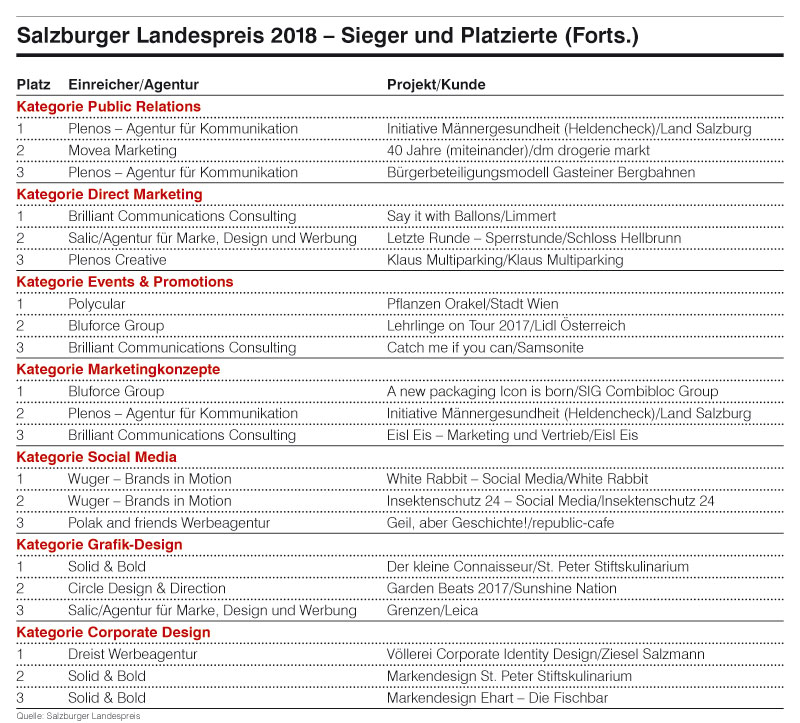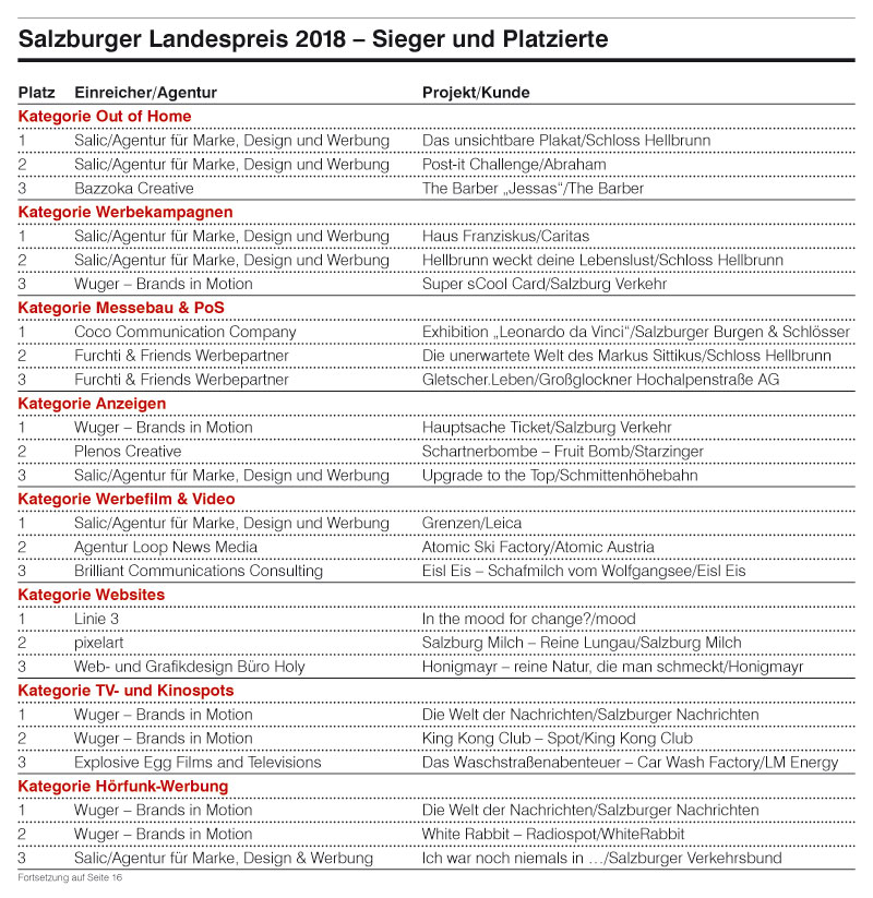 Aus den eingereichten Projekten wählte eine internationale Jury 79 Arbeiten aus – bewertet wurden ausschließlich die Idee und kreative Umsetzung der Projekte. Sowohl die Größe des Kunden als auch das Budget waren keine Kriterien, somit hatten kleine Agenturen und „Small-Business-Projekte“ dieselben Chancen. „Sowohl die Qualität der eingereichten Arbeiten als auch die Kunden belegen, dass die Salzburger Agenturen keinen Vergleich scheuen müssen. Das hat sich vergangenen Herbst auch beim ersten österreichischen Bundeswerbepreis, dem Austriacus, klar gezeigt. Hier hatte Salzburg mit der höchsten Anzahl an ausgezeichneten Agenturarbeiten die Nase vorn!“, so Mrazek und weiter.