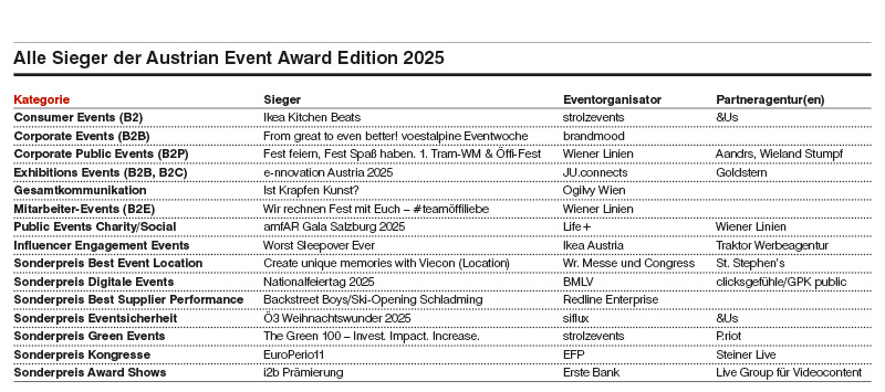Berndl: Wir arbeiten mit einer 19-köpfigen Experten-Jury aus Österreich, Deutschland und der Schweiz. Darunter unter anderem auch Cornelia Zanger, eine der führenden Expertinnen Europas im Bereich Eventforschung. Die Jury arbeitet äußerst gewissenhaft und bringt enormes Know-how ein. Die Bewertung erfolgt in einem zweistufigen Prozess mit klar definierten Kriterien. Natürlich kann es bei diesem Niveau auch Enttäuschungen geben, wenn es das eigene Projekt nicht unter die Nominierten schafft. Aber wer beim AEA einreicht, gehört bereits zu den Besten. Der Award ist auch ein Ansporn, dranzubleiben, sich weiterzuentwickeln und immer besser zu werden.