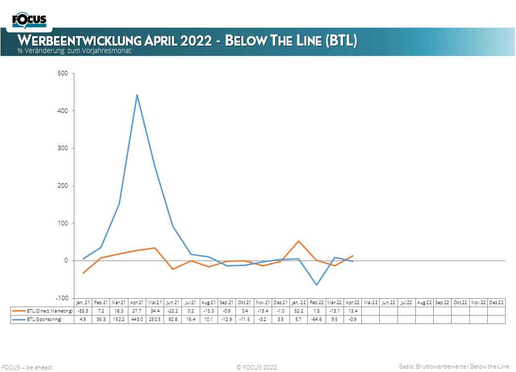 Auch die Bereiche Transport (22,8%), Regionale Wochenzeitungen (22,7%), Street Furniture (21%) und Privater Hörfunk (20,8%) verbuchen im Schnitt Steigerungsraten von über 20%. Leichte Verluste gibt es im April lediglich beim Sponsoring.