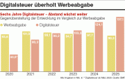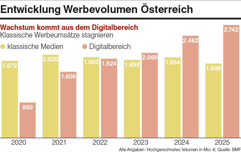 Für 2025 ergibt sich daraus ein über die Digitalsteuer erfasstes Werbevolumen von rund 2,74 Mrd. €. In klassischen Medien wurden im selben Jahr rund 1,81 Mrd. € geworben. Damit liegt der über die Digitalsteuer erfasste Digitalbereich deutlich vor den klassischen Medien. Der kombinierte Markt aus diesen beiden steuerlich erfassten Bereichen erreicht rund 4,55 Mrd. €.