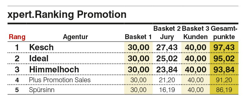 Kesch kann sich im xpert.Ranking der Promotion-Agenturen gegen Ideal Live Marketing und Himmelhoch durchsetzen.