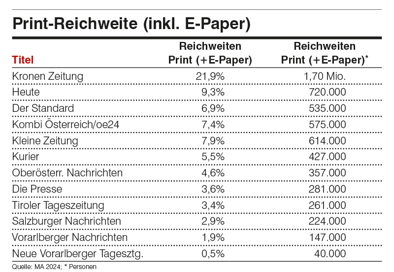 Denn es erfolgt eine Justierung der Media-Analyse-Daten an den ÖWA-Werten. Parallel wird weiterhin die Print-Reichweite (+E-Paper) und die CrossMediaReach (exklusive Newsletter) von der Media-Analyse ausgewiesen. Insgesamt wurden für die aktuelle Erhebung rund 15.500 Personen von Jänner bis Dezember 2024 befragt.