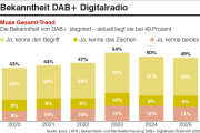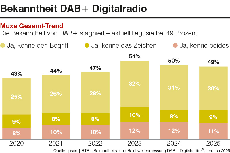 Hinsichtlich der Bekanntheit von DAB+ zeigt sich durch die Studie, dass rund die Hälfte der Österreicherinnen und Österreicher schon von DAB+ gehört haben, also den Begriff Digitalradio, das Logo von DAB+ oder beides kennen. Damit liegt die Bekanntheit 2025 zwar deutlich über dem Wert der ersten Befragung aus dem Jahr 2020, an den Spitzenwert aus dem Jahr 2023 (damals 54%) kam sie aber heuer nicht heran.
