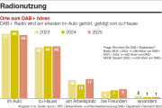 Weiterhin am stärksten genutzt wird DAB+-Radio 2025 im Auto (von 56% der Befragten), wenngleich dieser Wert in den vergangenen zwei Jahren bereits höher war. Gleichgeblieben ist hingegen der DAB+-Konsum zu Hause (46% der Befragten), jener am Arbeitsplatz konnte im Vergleich zu den Vorjahren auf 17% anwachsen. Acht Prozent gaben im aktuellen Untersuchungszeitraum an, DAB+-Radio bei Freunden oder Verwandten zu hören. Ein Prozent hört DAB+-Radio an anderen Orten, etwa im Kaffeehaus, in Geschäften oder beim Spazierengehen.