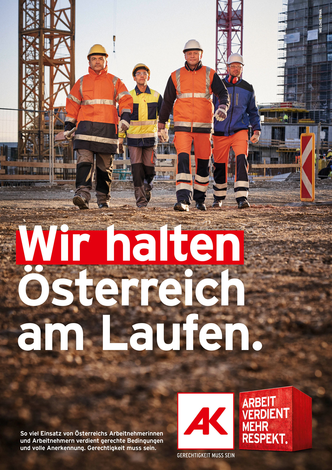 „Arbeit verdient mehr Respekt.“ ist das Motto einer bundesweiten Kampagne, erdacht von We Love\TBWA. Darin stellt die Arbeiterkammer die vielen Menschen in den Mittelpunkt, die tagtäglich dafür sorgen, dass alles glatt läuft: die schon frühmorgens und noch spätabends im Supermarkt arbeiten, damit wir jederzeit einkaufen können, die nachts Straßen und Schienen reparieren, uns in den Öffis sicher zur Arbeit bringen, während wir nochmal die Augen zumachen, unsere Liebsten gesund pflegen, bei Wind und Wetter am Bau oder im Akkord in der Industrie arbeiten und viele andere mehr. Sie werden in einem TV und Kino-Spot, sechs Print-Sujets und einer Radio-Kampagne, die öffentlich Danke sagt, selbstbewusst inszeniert. Die österreichweite Kampagne wird regional mit Dialog-