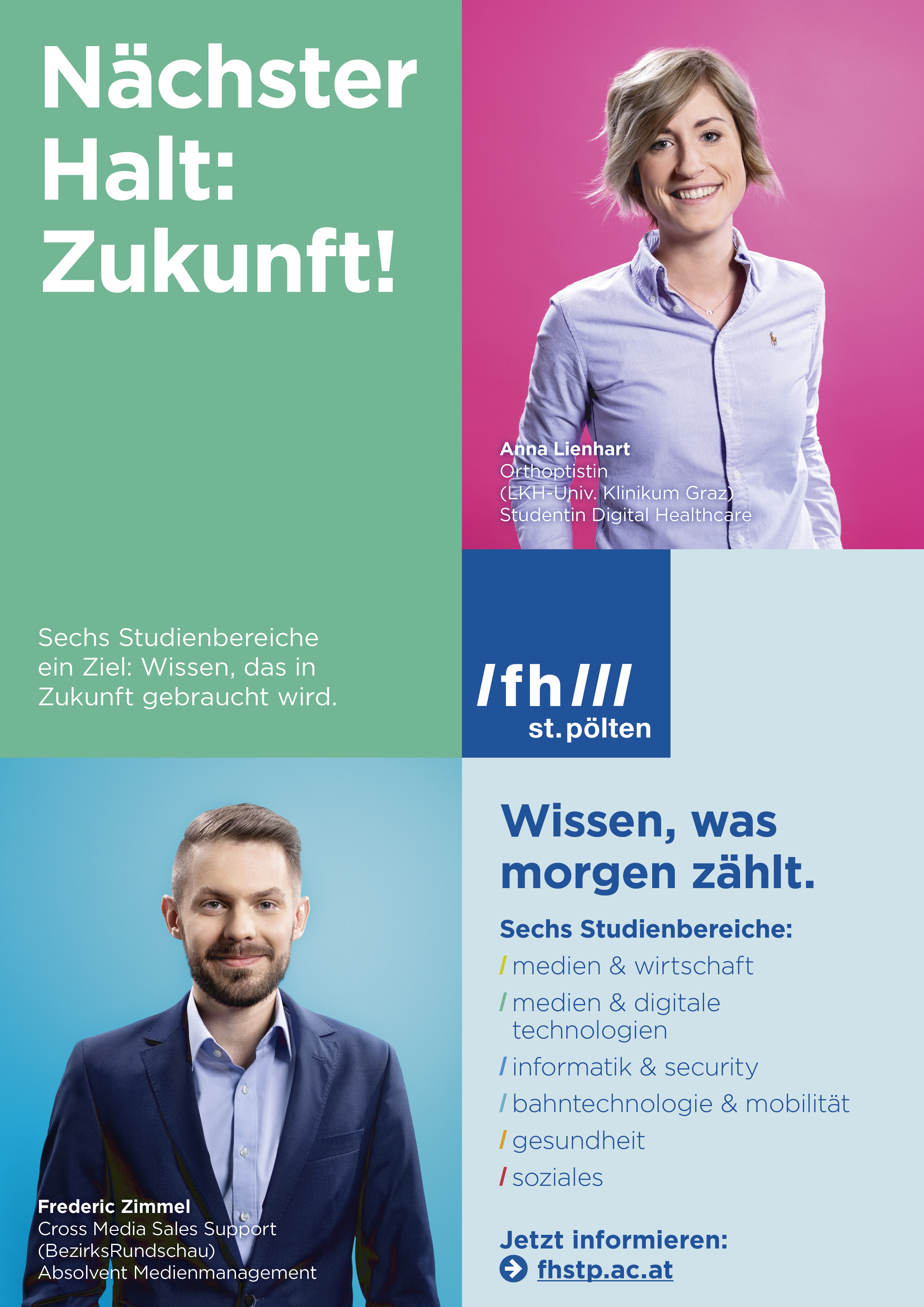 „Wir haben bewusst Studierende und Absolventen in die Konzeption und Durchführung der Werbelinie integriert. Auf der Basis von Fokusgruppen wurden Meinungen und Ansichten herausgefiltert und in die neue Werbelinie integriert“, so Daniela Kaser, Leiterin der Marketing- und Unternehmenskommunikation der FH St. Pölten. Neben dem rationalen Benefit der Zukunfts-Bildung kristallisierte sich in den Interviews mit Studierenden auch ein klarer emotionaler Mehrwert heraus. Es wurden mehrfach die familiären Strukturen und die angenehme Lernatmosphäre hervorgehoben. Im Konzeptionsprozess der Kampagne wurde daher von Anfang an darauf geachtet, diese emotionale Komponente ebenfalls widerzuspiegeln.