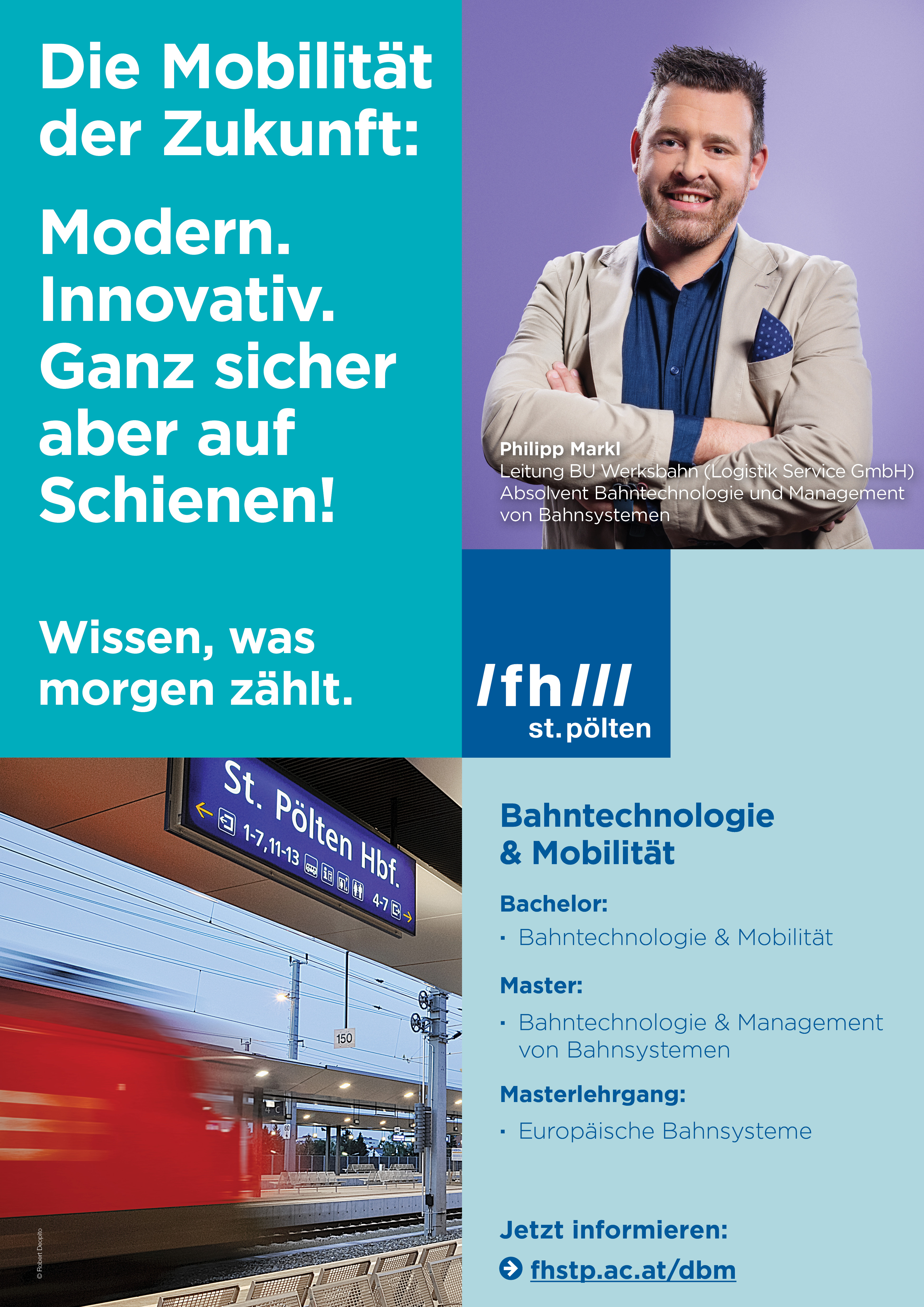 Der Claim „Wissen, was morgen zählt“ ist für die FH St. Pölten gleichzeitig auch ein Auftrag. „Wir wollen stets unser Ausbildungsangebot weiterentwickeln, um auf die sich rasch wandelnden Anforderungen des Arbeitsmarktes reagieren zu können“, betont Gernot Kohl, Geschäftsführer der FH St. Pölten. Hier steht insbesondere die Digitalisierung sowie die Vermittlung von Future Work Skills im Vordergrund.