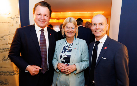 Bundesministerin Klaudia Tanner mit den RegionalMedien Austria Vorständen Georg Doppelhofer (l.) und Andreas Eisendle (r.).